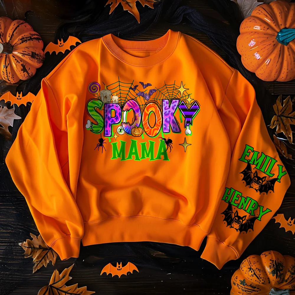 Customizable with “Spooky MAMA/GRANDMA” title and 1-6 family names, soft cotton-poly blend for autumn comfort. Perfect for daily wear or family gatherings.