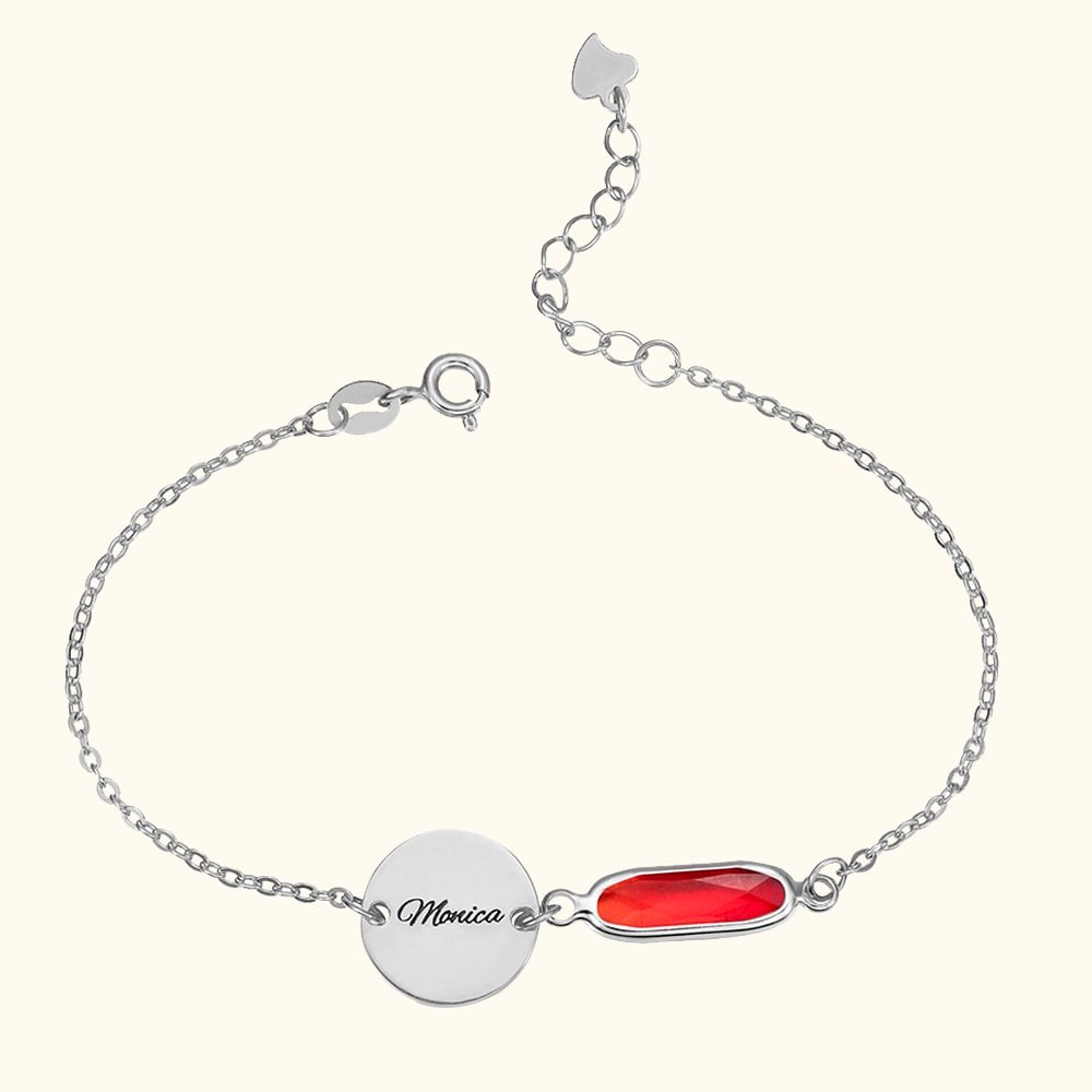 • Callie’s bracelet is designed with the most popular elements, names and birthstones. A chain connects the beautiful birthstone with the customized name to create a unique shiny look for any occasion. Simple and elegant, it is perfect for stacking with other bracelets to create a stylish effect. The name of the wearer is a great idea for a gift to yourself or a friend.