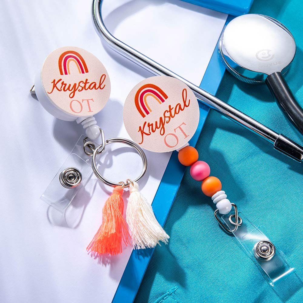 The option of tassels or beads further enhances the charm of this badge reel. The tassels add a playful and trendy element, swaying gently as you move. They come in various colors that complement the rainbow theme, creating a visually appealing look. On the other hand, the beads offer a more elegant and refined touch. They are carefully selected to match the overall aesthetic, giving the badge reel a sophisticated edge.