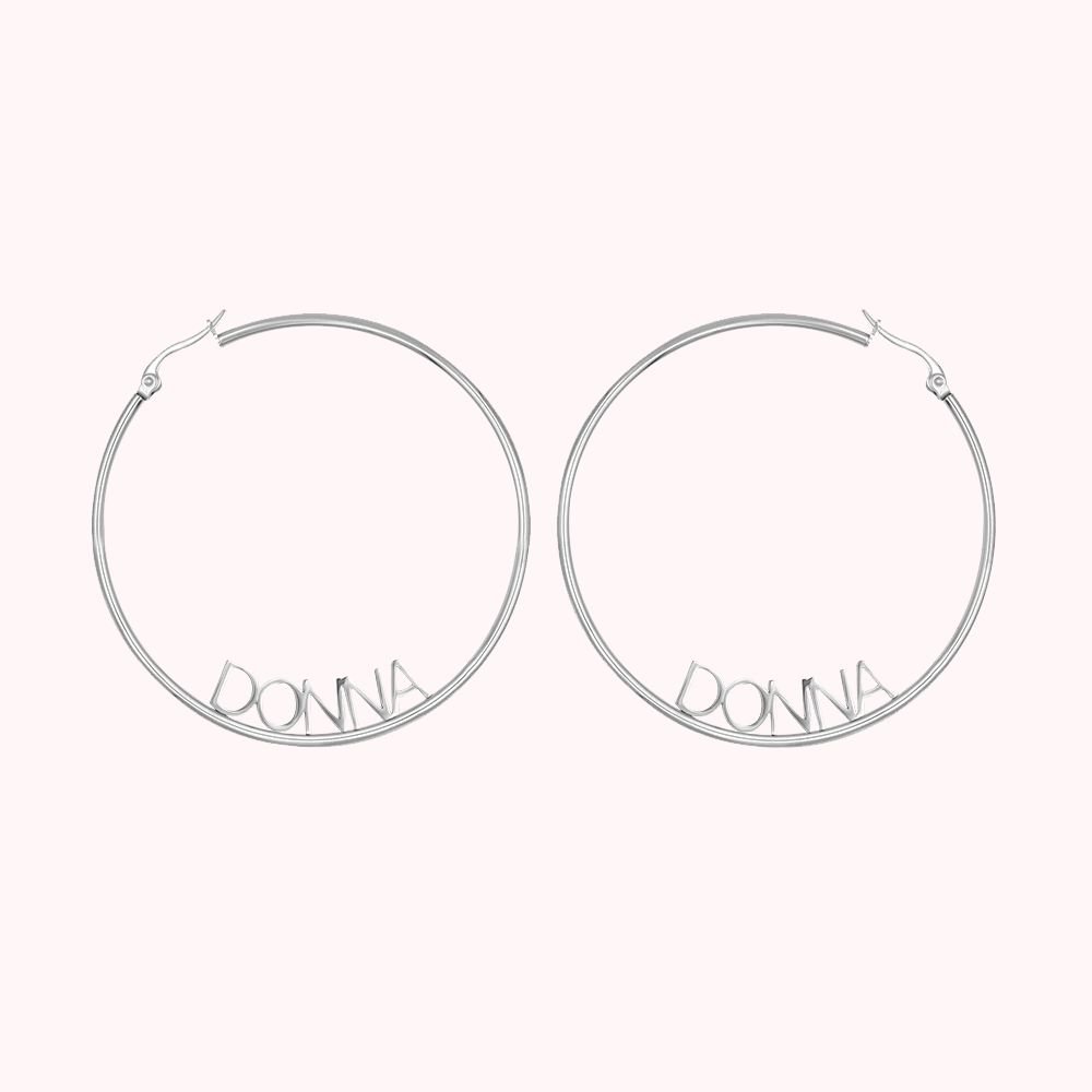 •These earrings offered by Callie has simple and sleek circle line decorated with a custom block-shaped inscription, your name or special words will find its perfect place in this shining hoop. Available in three different hoop size whose diameter is range from 50mm to 70mm, no need to worry the size is too big or not big enough, just show your style with the size you want. A distinctive way to dress up everyday looks and suitable for work or leisure outfit.