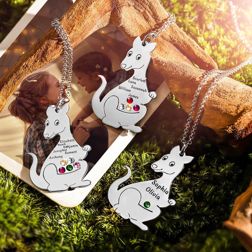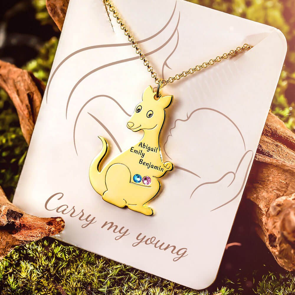 •Offer a sweet and meaningful gift for a mom with a necklace that is with a kangaroo mom engraved with names, which uses the multicolour birthstone as a creative and fun symbol of birth month of her kids.
