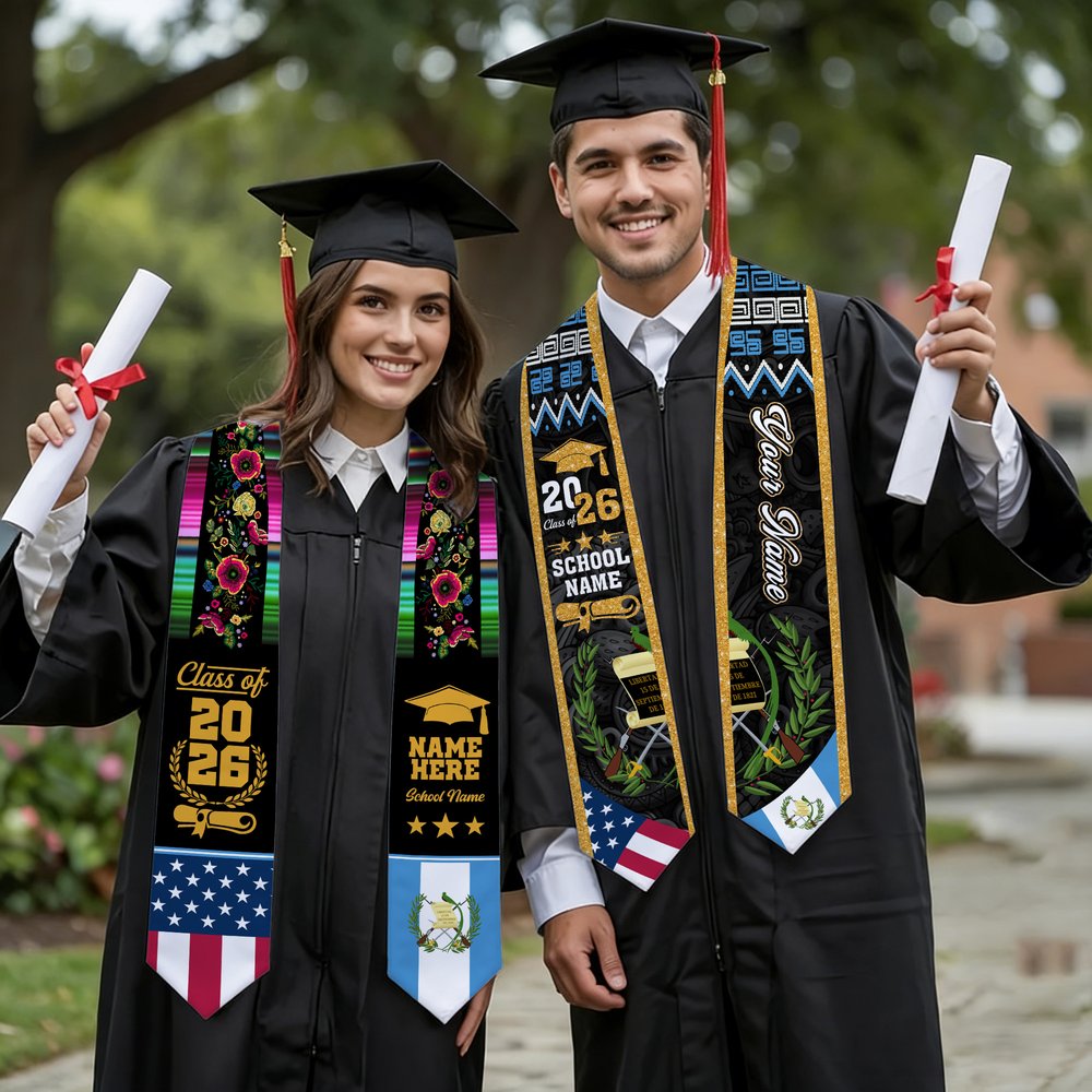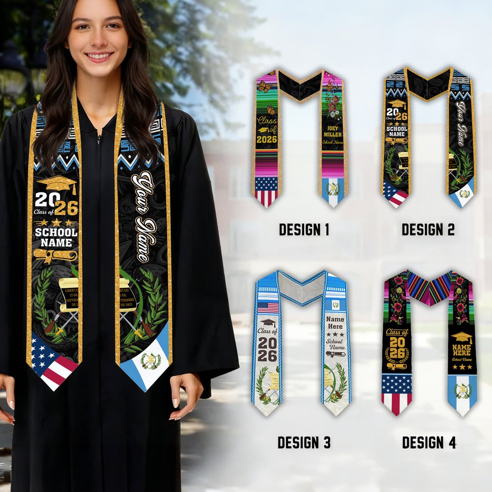 Centreed on the blue and white of the Guatemalan flag, this design blends vibrant cultural elements. The two ends feature the American and Guatemalan flags, allowing you to showcase your roots and cultural heritage proudly. Customizable with name, graduation year, and school name.