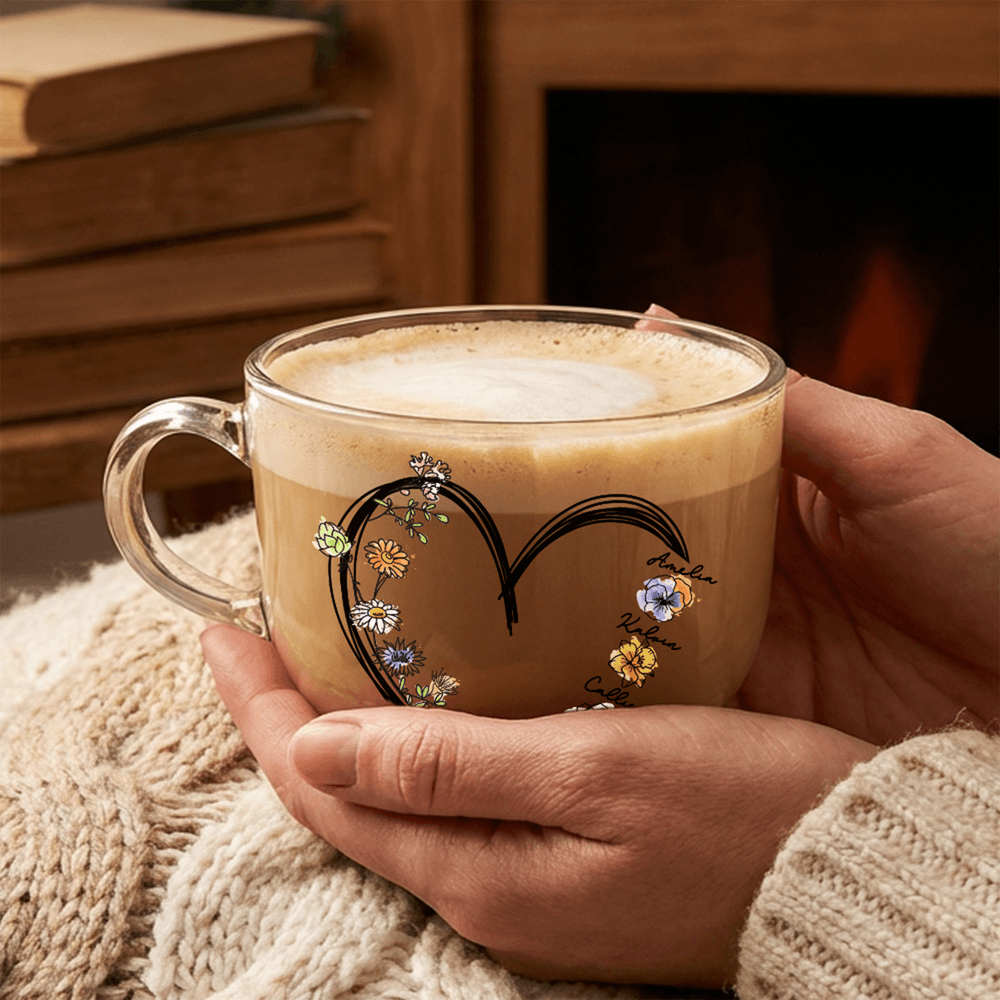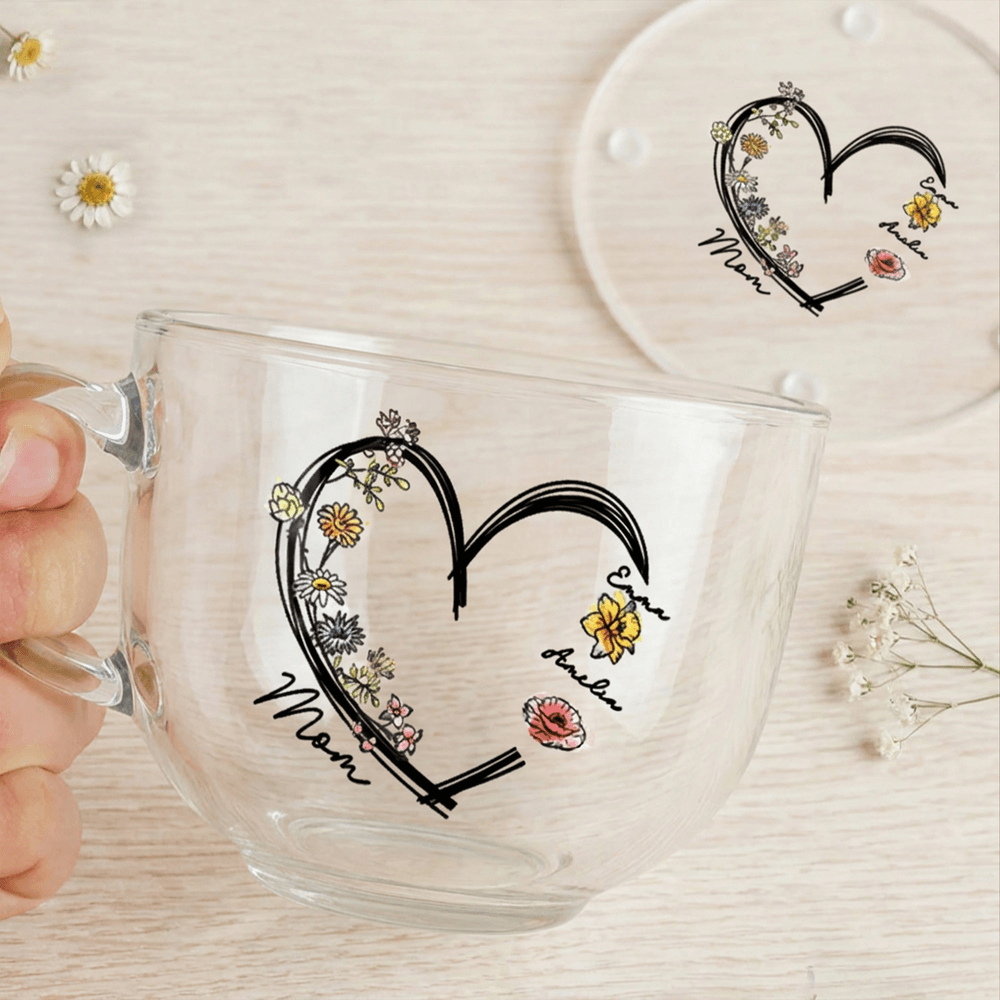This glass mug features a heart-shaped outline paired with birth flowers as its central design element, gently capturing the bond of motherly love and family ties. Inside the hand-drawn style heart, you can customize 1 to 6 birth flowers, each representing a different family member, accompanied by their names and a nickname. The clear glass body allows the floral design to stand out beautifully, making this not just a functional drinking mug but also a heartfelt keepsake of family love.
