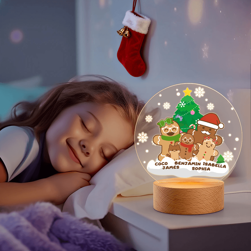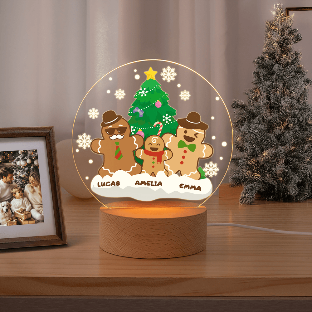 Featuring a gingerbread man design and classic Christmas tree elements, this nightlight exudes festive joy. Customization is available to include the image and name of each gingerbread man family member, making it a unique family item.