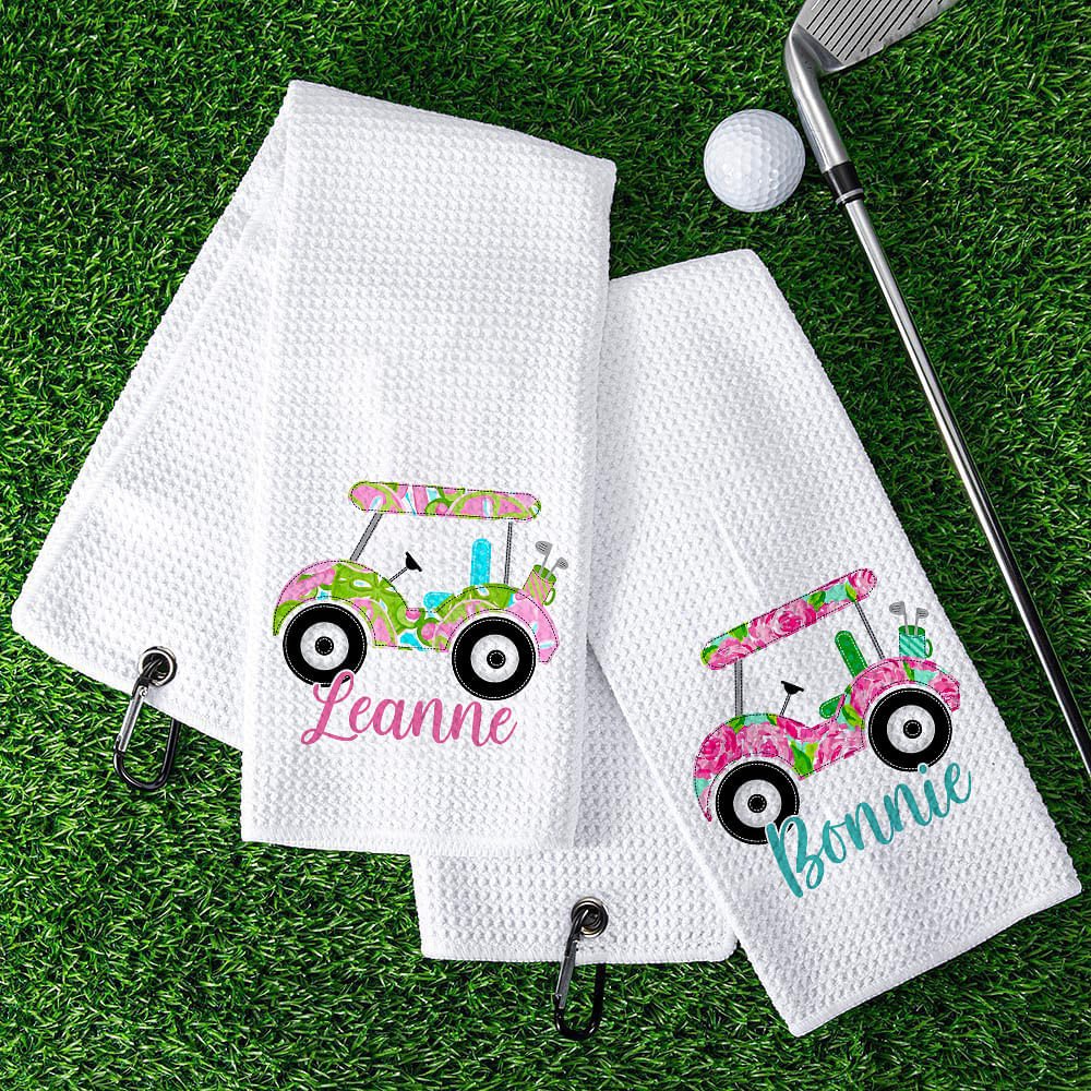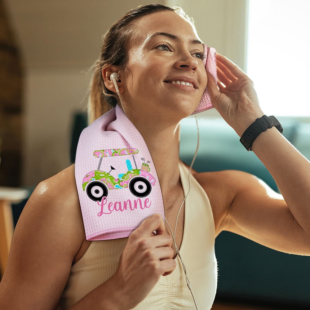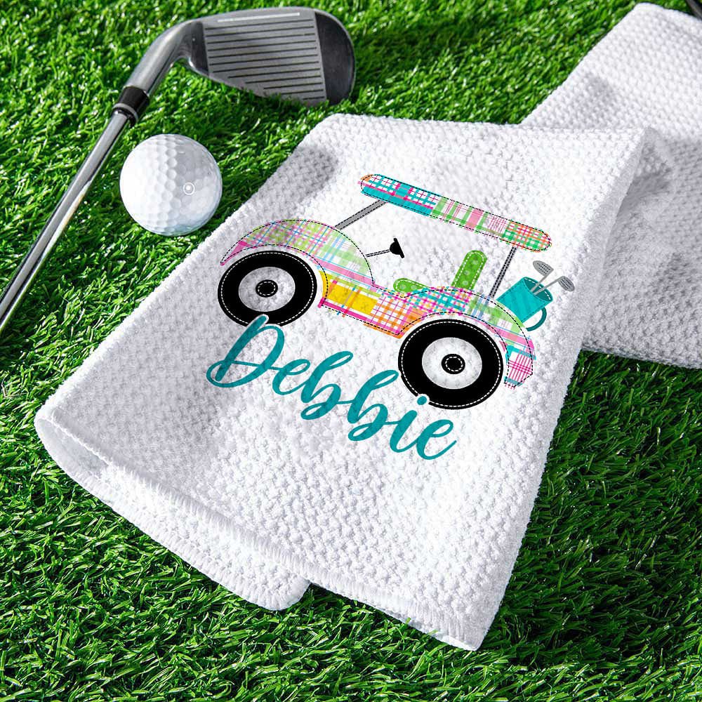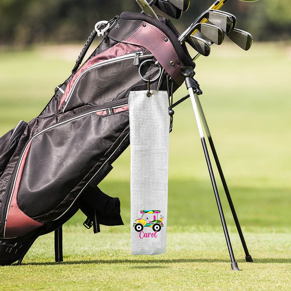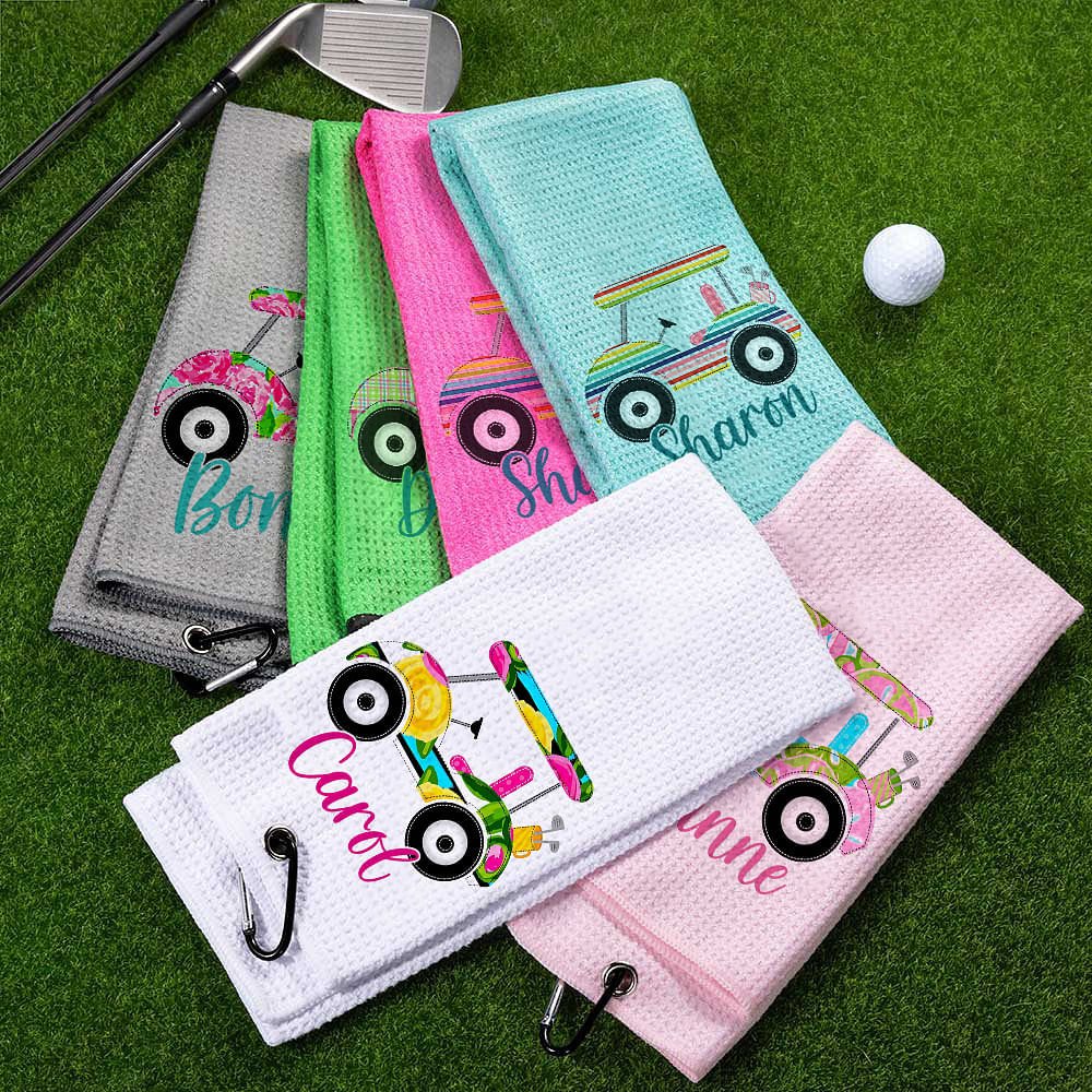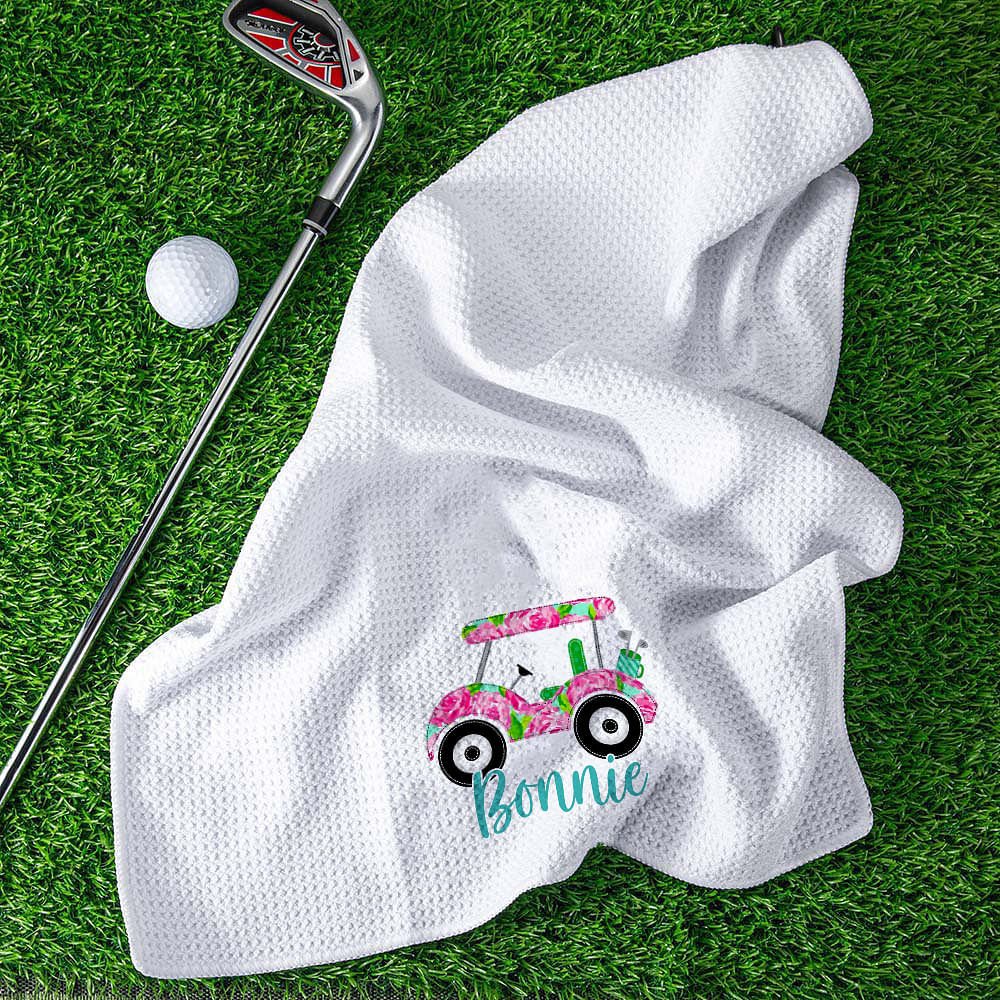 This waffle towel is designed for female golfers. It features a colourful golf cart and a customized name. It can show your love for and taste for golf, whether for yourself or as a gift.