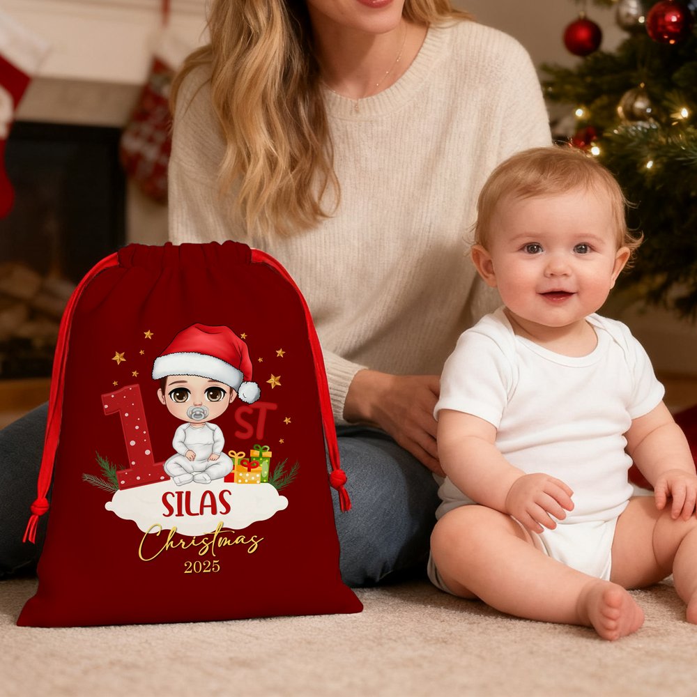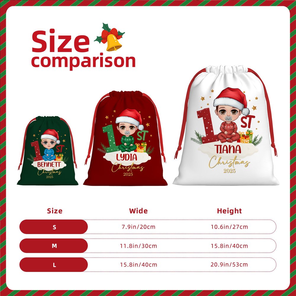 This gift bag features a cute cartoon character wearing a Santa hat, surrounded by Christmas elements like stars, gifts, and the word "1st," symbolizing your baby's first Christmas and brimming with Christmas cheer. We allow you to add your name and year to create a unique Christmas gift bag for your little one.