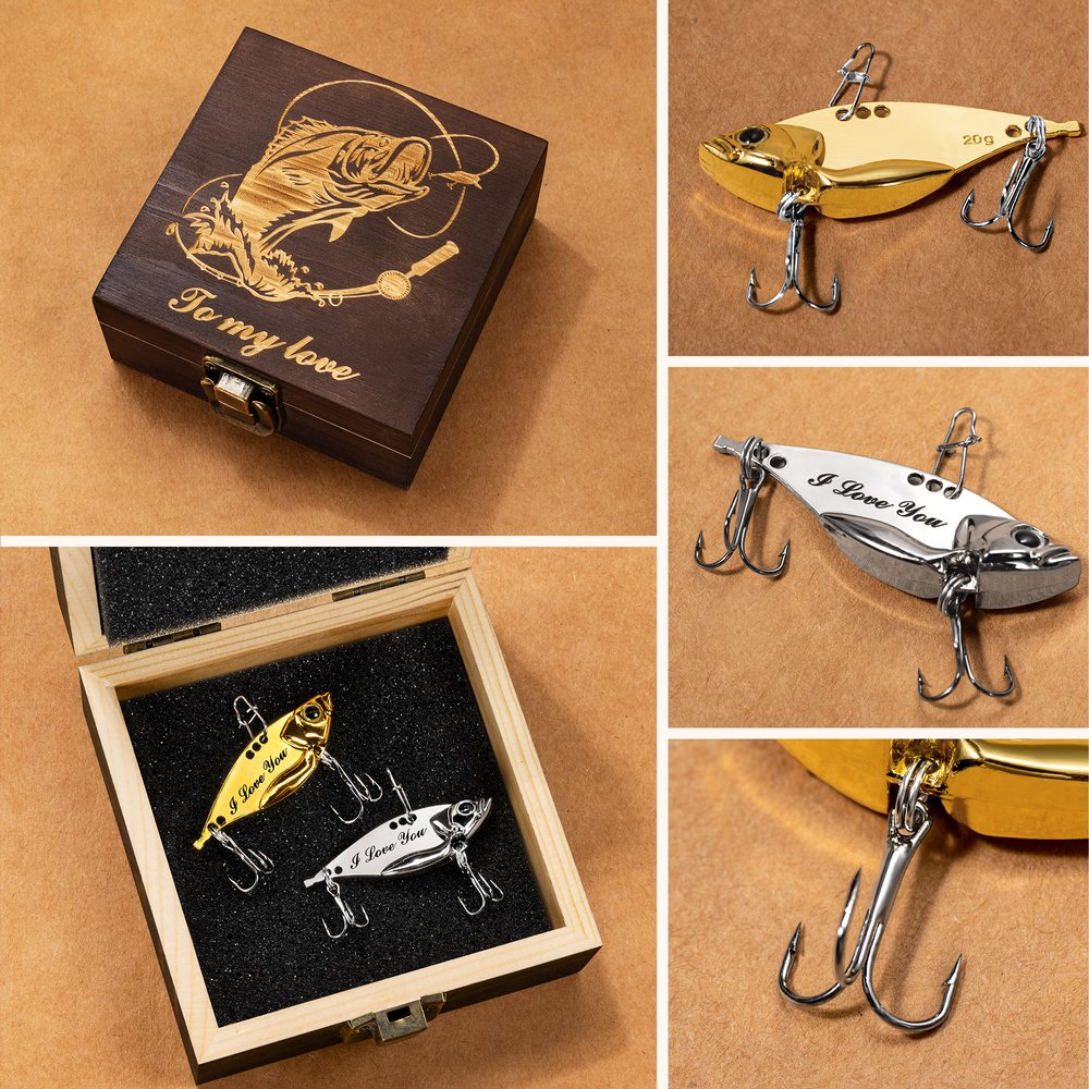 This bionic lure is very 3D, just like a real fish lure. One piece includes a vintage textured wooden box with a fixed fishing pattern and customizable words engraved on the front, and two lures inside, one gold and one silver, with 5 types of weights to choose from, suitable for fishing in various situations. The metallic finish and realistic design make these lures stand out and give anglers an exciting fishing experience.