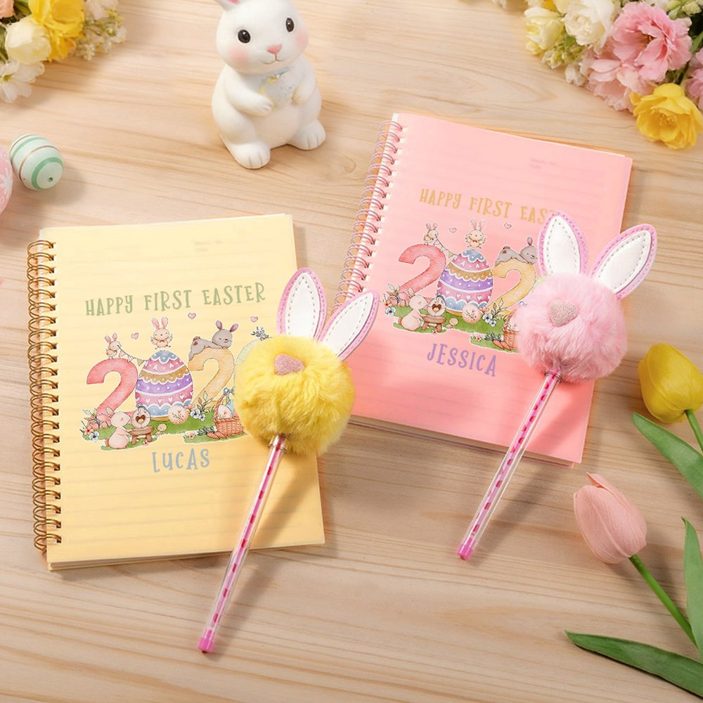 The cover features a cute rabbit and Easter eggs arranged in a 2026 shape, paired with “Happy First Easter” text and a customizable name. It comes with a matching plush rabbit ballpoint pen in multiple colours, brimming with Easter charm. This makes your child's notebook uniquely adorable.