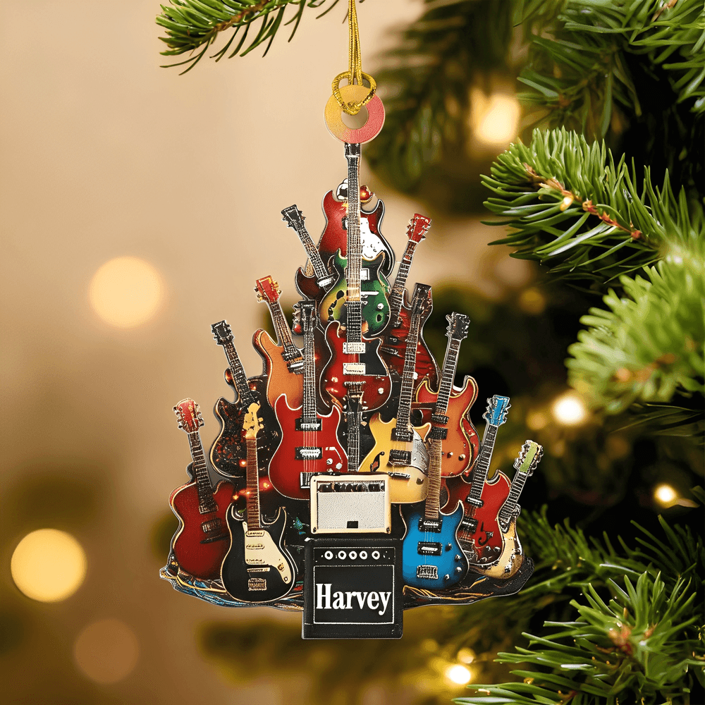 This unique Christmas tree ornament features a dynamic cluster of multiple electric guitars, intricately crafted to capture their stylish details. The customizable name area allows for a subtle blend of musical passion and a personal touch, making each piece a unique showcase of personality and a striking decorative statement.