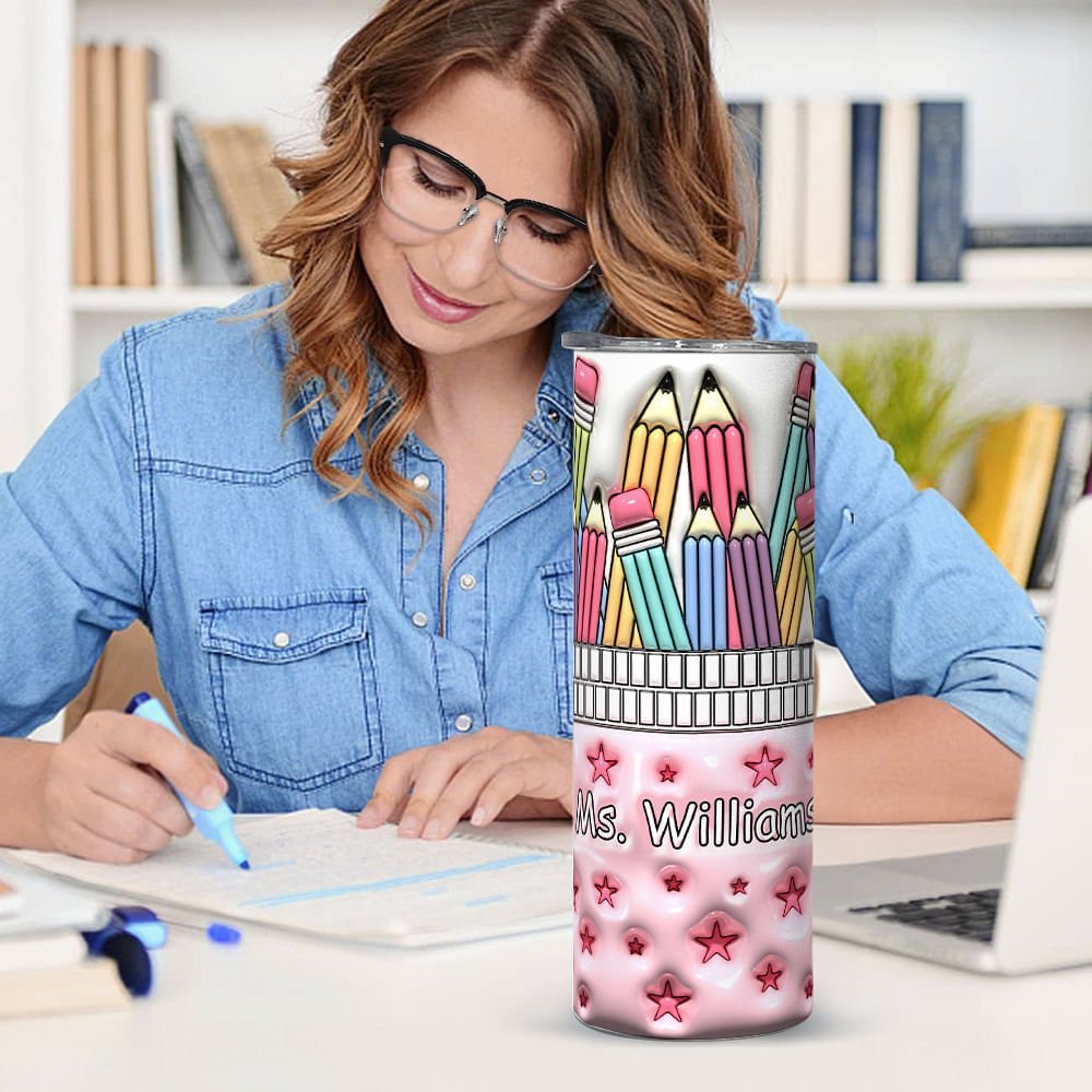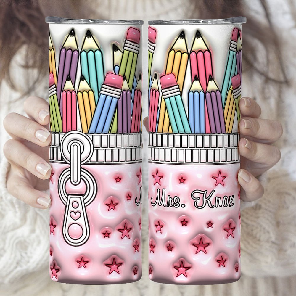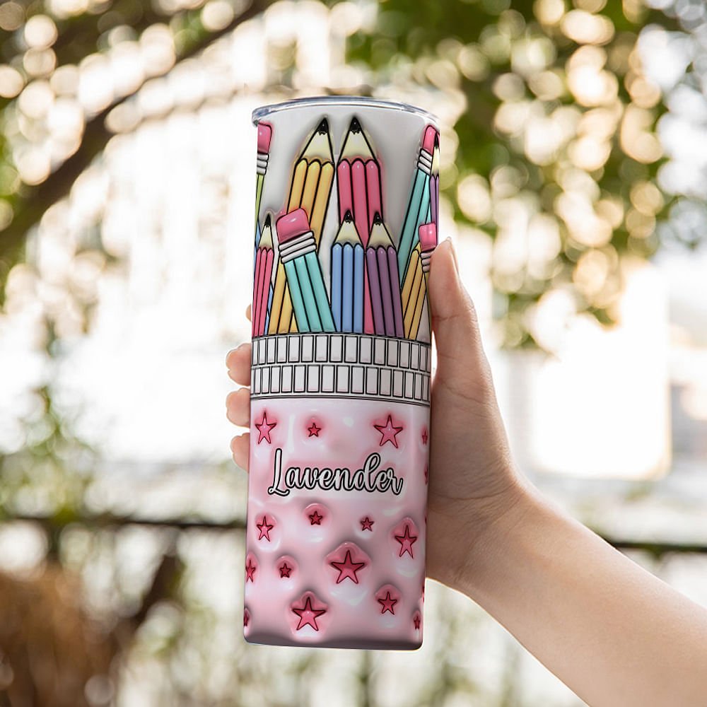 Designed around a teacher theme, our skinny tumbler features a realistic 3D effect and incorporates coloured pencils, a pencil bag, and pink star elements for a fun and artistic feel with vibrant colours and vivid details.