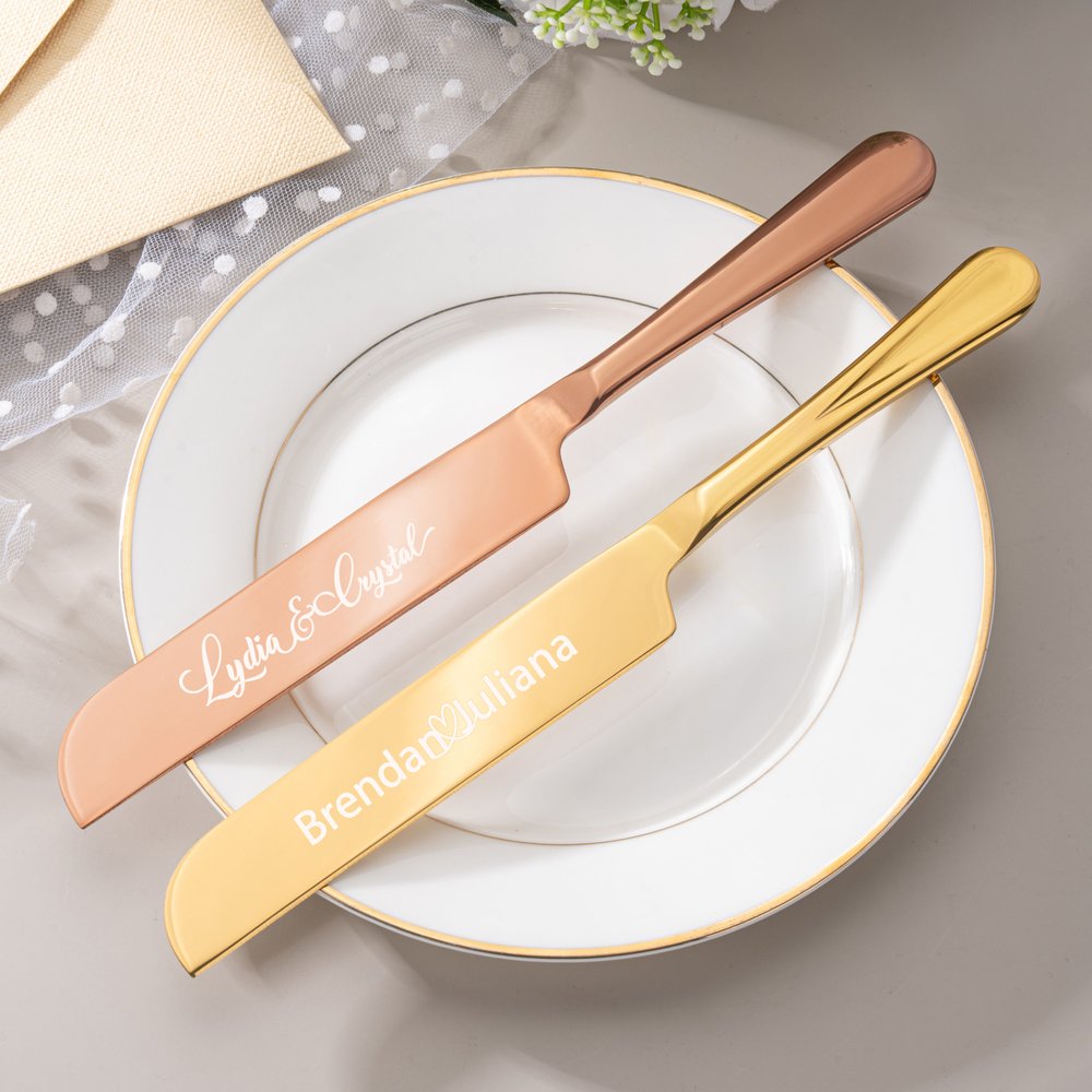This product is available in both single and complete sets. The set includes a cake knife, fork, spatula, and exquisite storage box. Each piece can be engraved with a name, commemorative date, surname, etc., to freeze the sweet moments for the newlyweds.