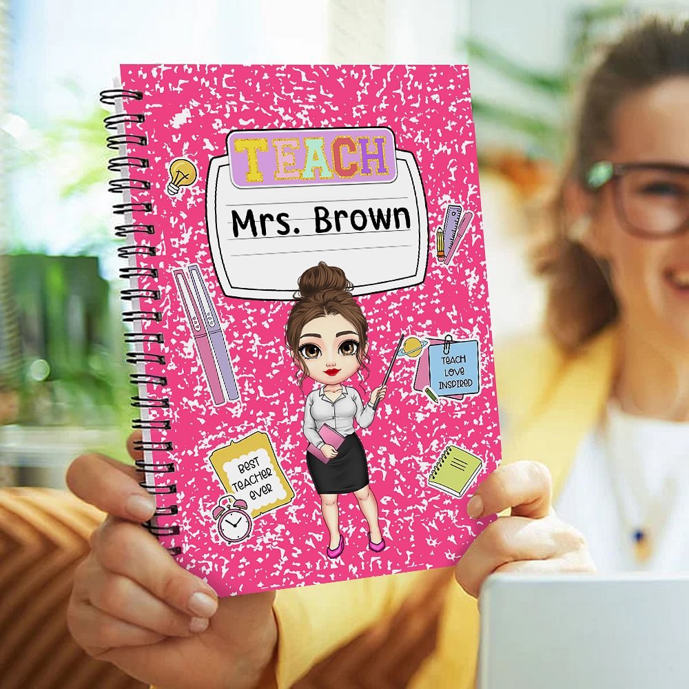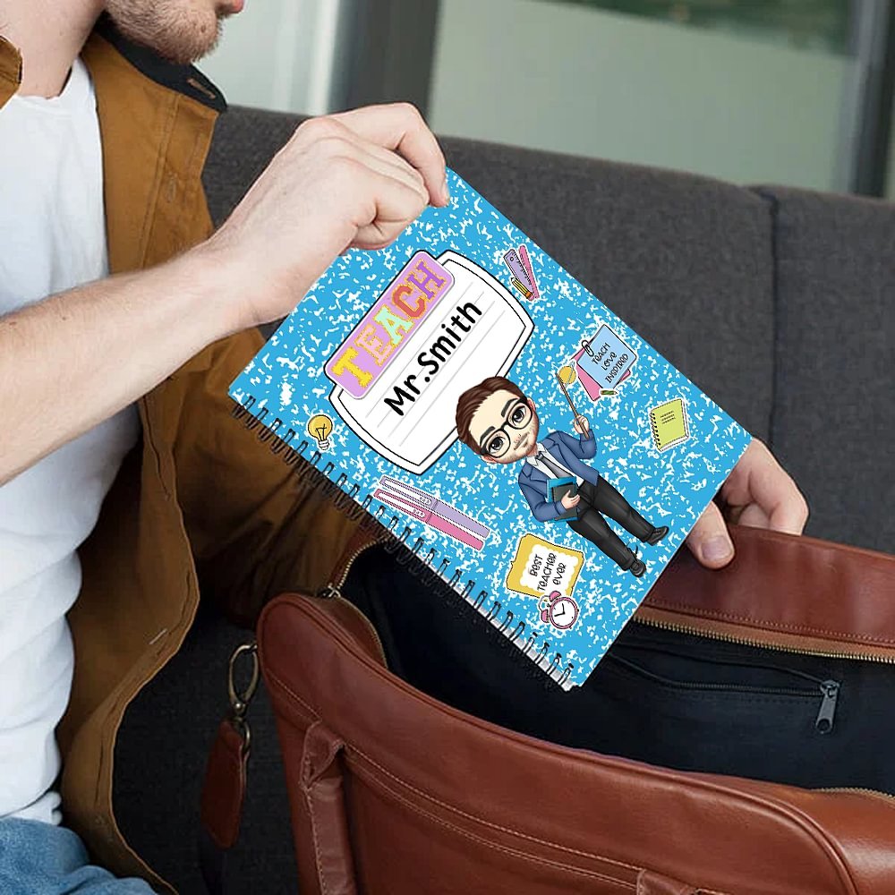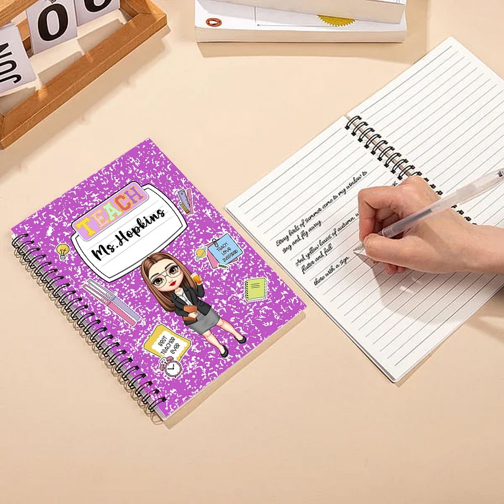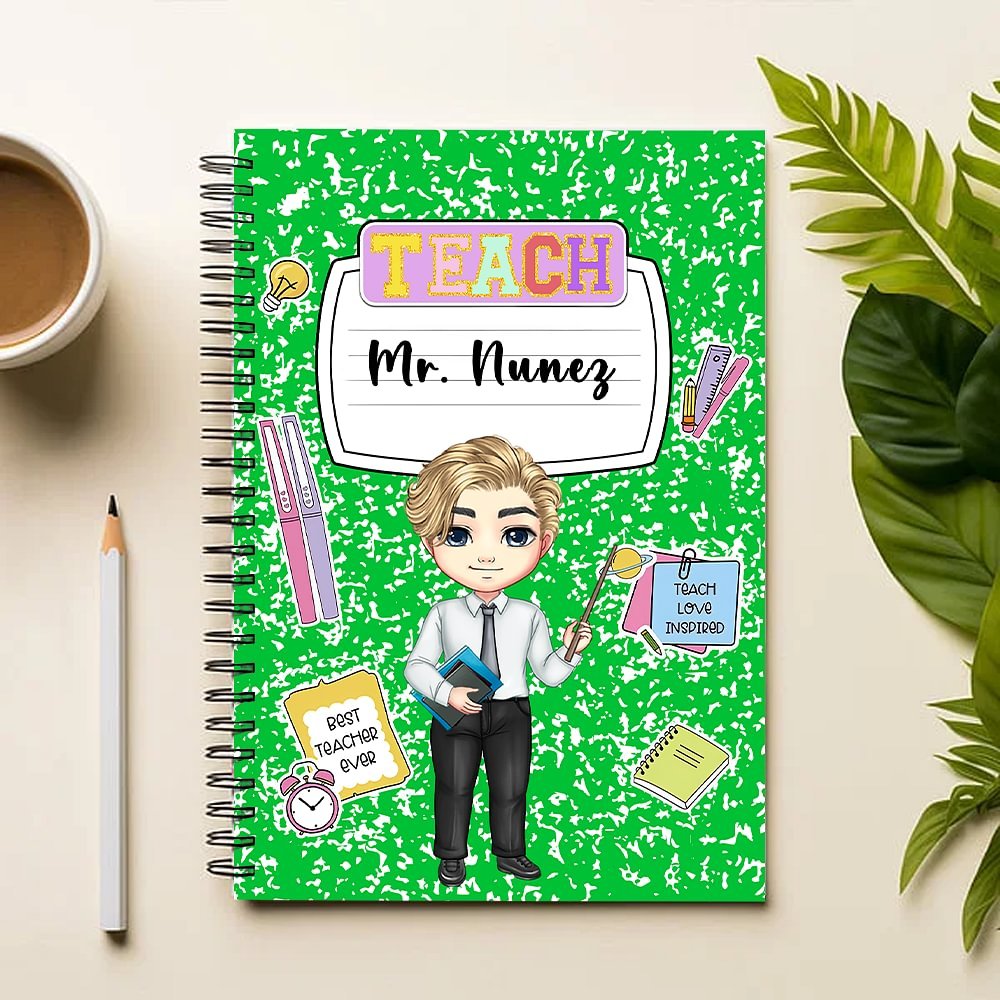 This teacher-specific notebook combines the style of cartoon characters and clip art. It is not only beautiful in appearance, but also full of fun and affinity. You can freely choose the character image according to the characteristics of the teacher, and match it with various patterns such as drinks, books, and pointers in the background to create a unique and exclusive design. In addition, the notebook also provides a variety of fonts to choose from, so that the teacher's name can be Personalized on the cover to highlight the unique identity and personality.