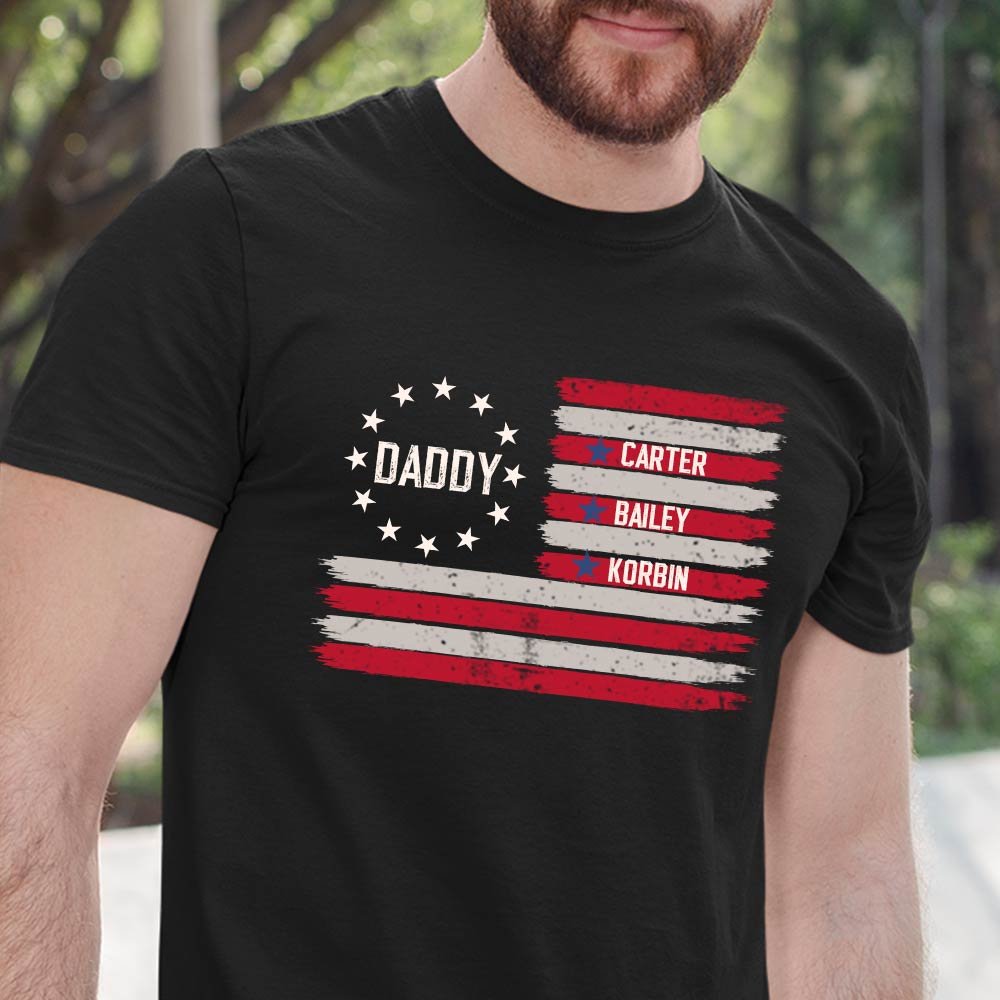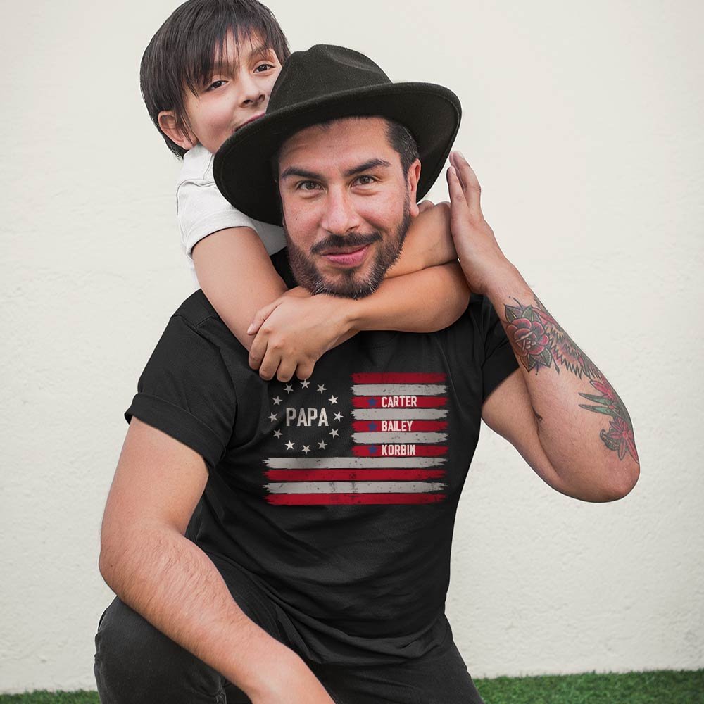 This T-shirt features an American flag design and can be customized with the father's nickname and the names of children 1-8, making this piece unique. The clothes also show the close relationship between father and son, which is very heartwarming.