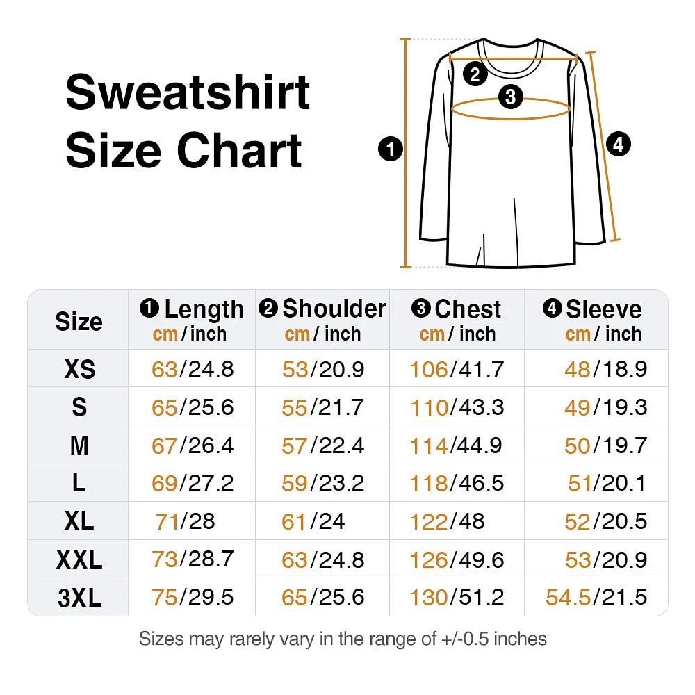 | Measurement: | T-shirt - XXS, XS, S, M, L, XL, 2XL, 3XL, 4XL, 5XL Sweatshirt - XS, XS, S, M, L, XL, 2XL, 3XL |