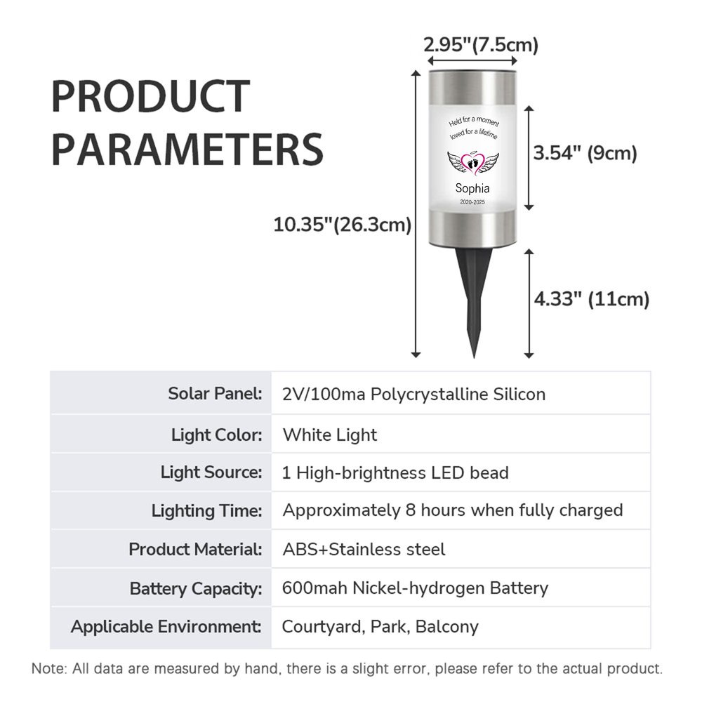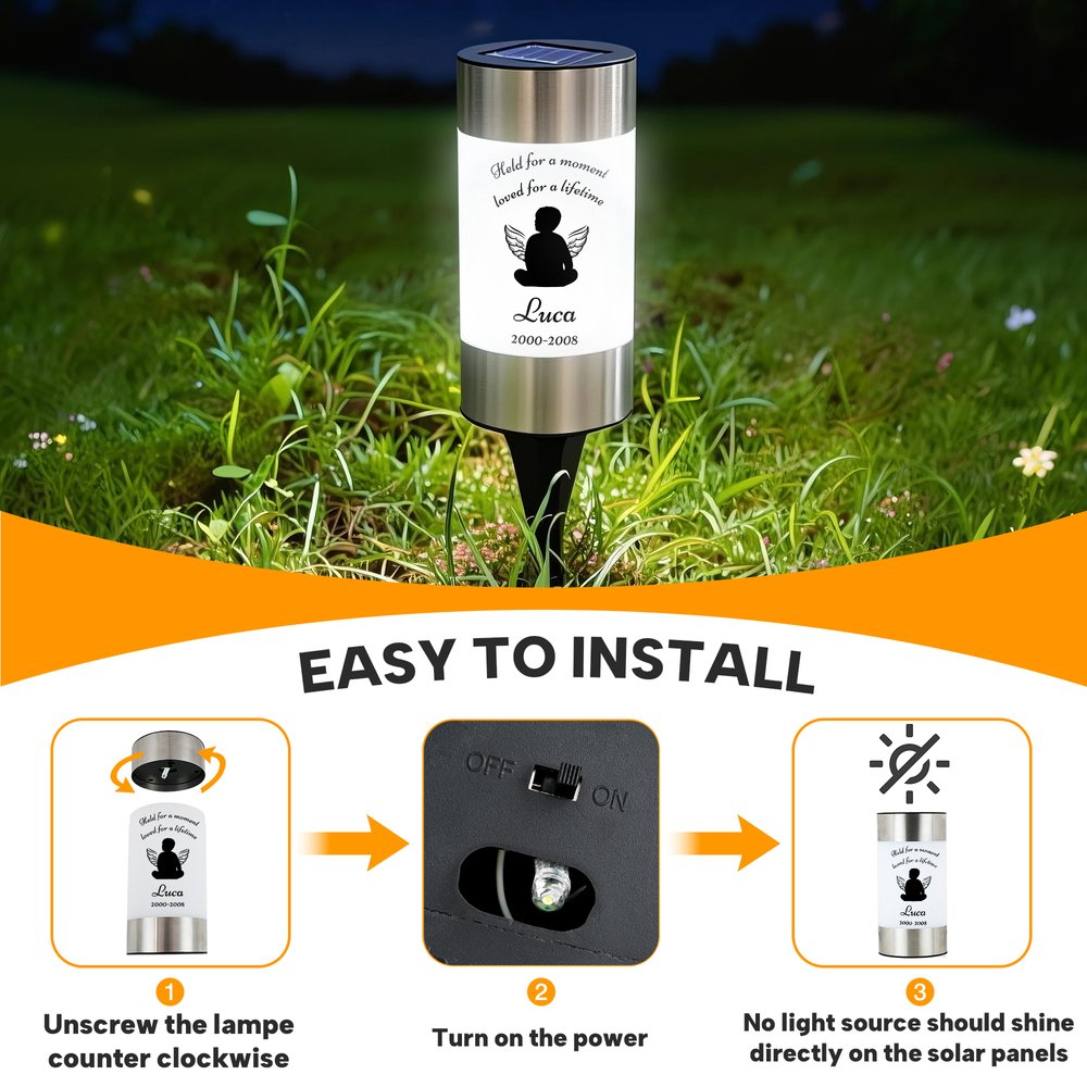 This solar garden light is designed with warmth and profound meaning. Available in a variety of silhouette designs, including angel babies, boys and girls, and men and women, it meets diverse commemorative needs. You can customize the name and date of death to make this memorial truly unique. Each design element embodies deep affection and remembrance for the deceased, presenting thoughts visually and beautifully, offering spiritual comfort when remembering a loved one.