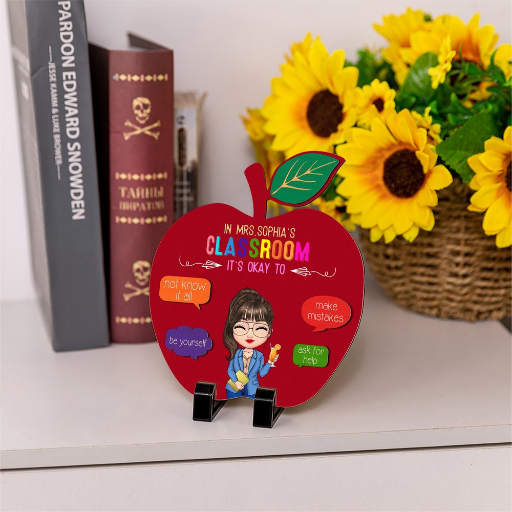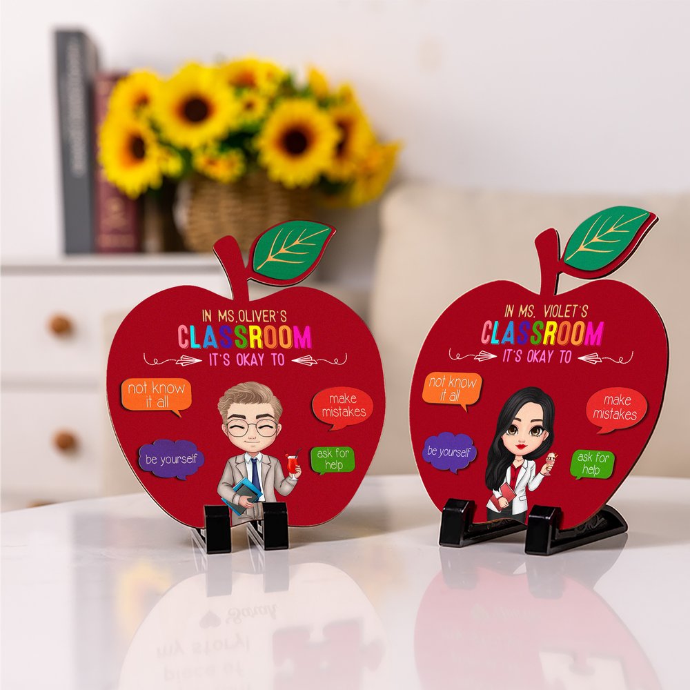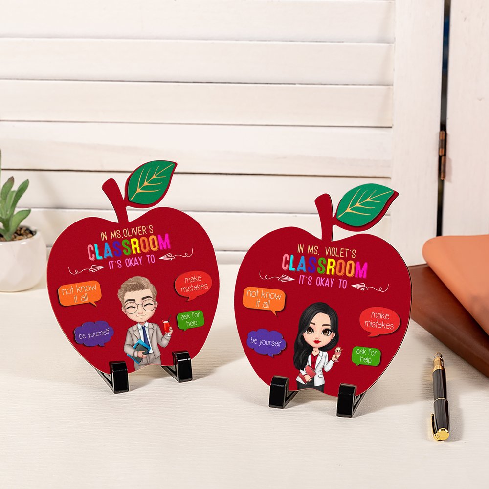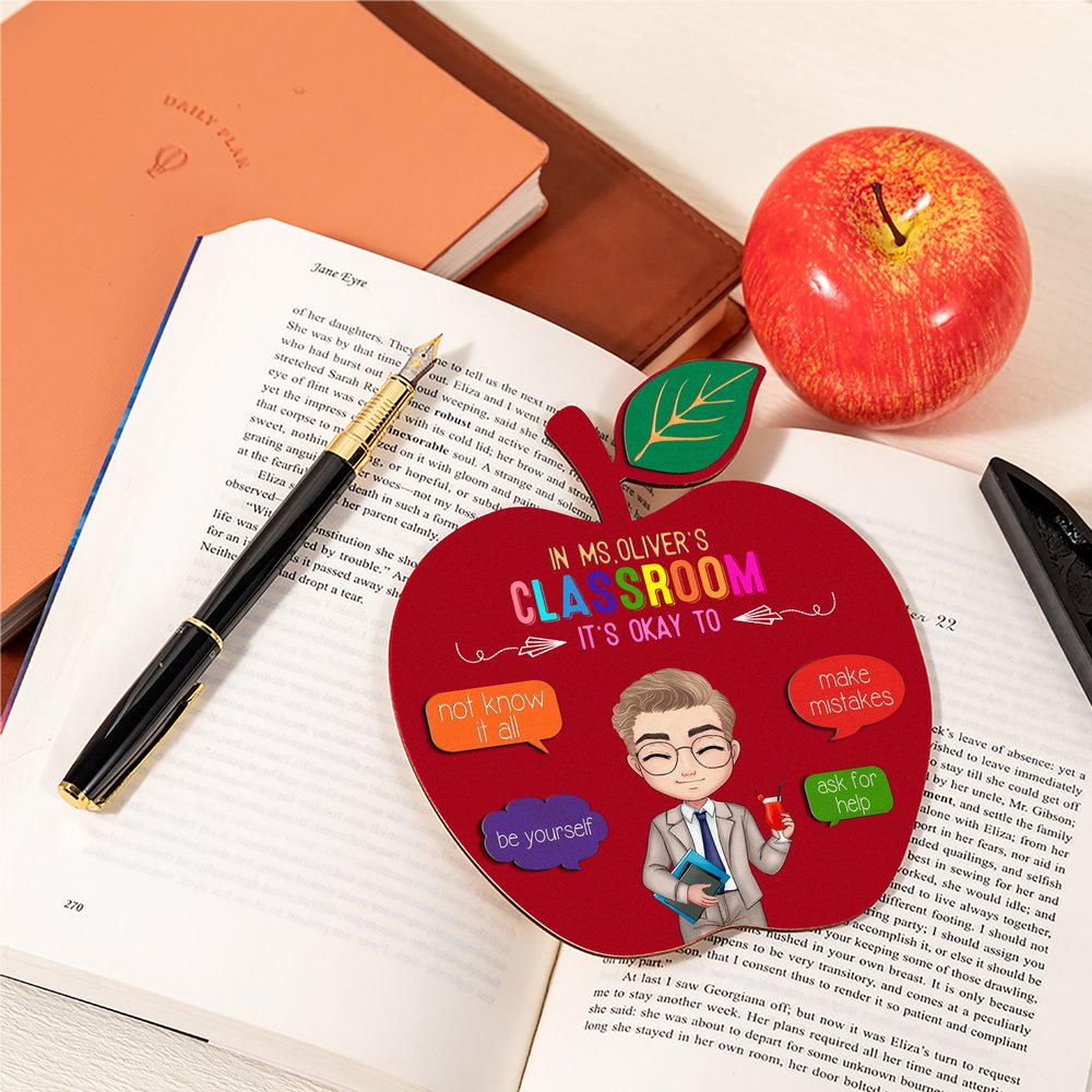 This ornament is designed with a vibrant red apple shape, symbolizing education, and a cartoon teacher image you can customize. The words "It's okay to not know it all, make mistakes, be yourself, ask for help" inspire a positive and supportive learning atmosphere. Its design makes it a standout piece for any classroom or office.