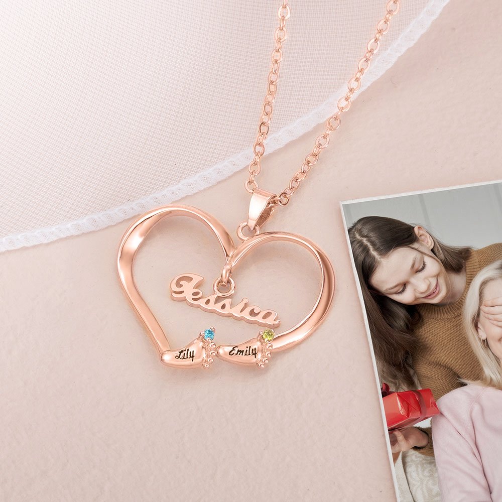 The baby feet necklace represents the love between mother and children. This necklace is composed of a heart shape surrounded by the feet (children) with birthstones, which is exquisite in appearance, expressing a deep and forever love between mother and children.