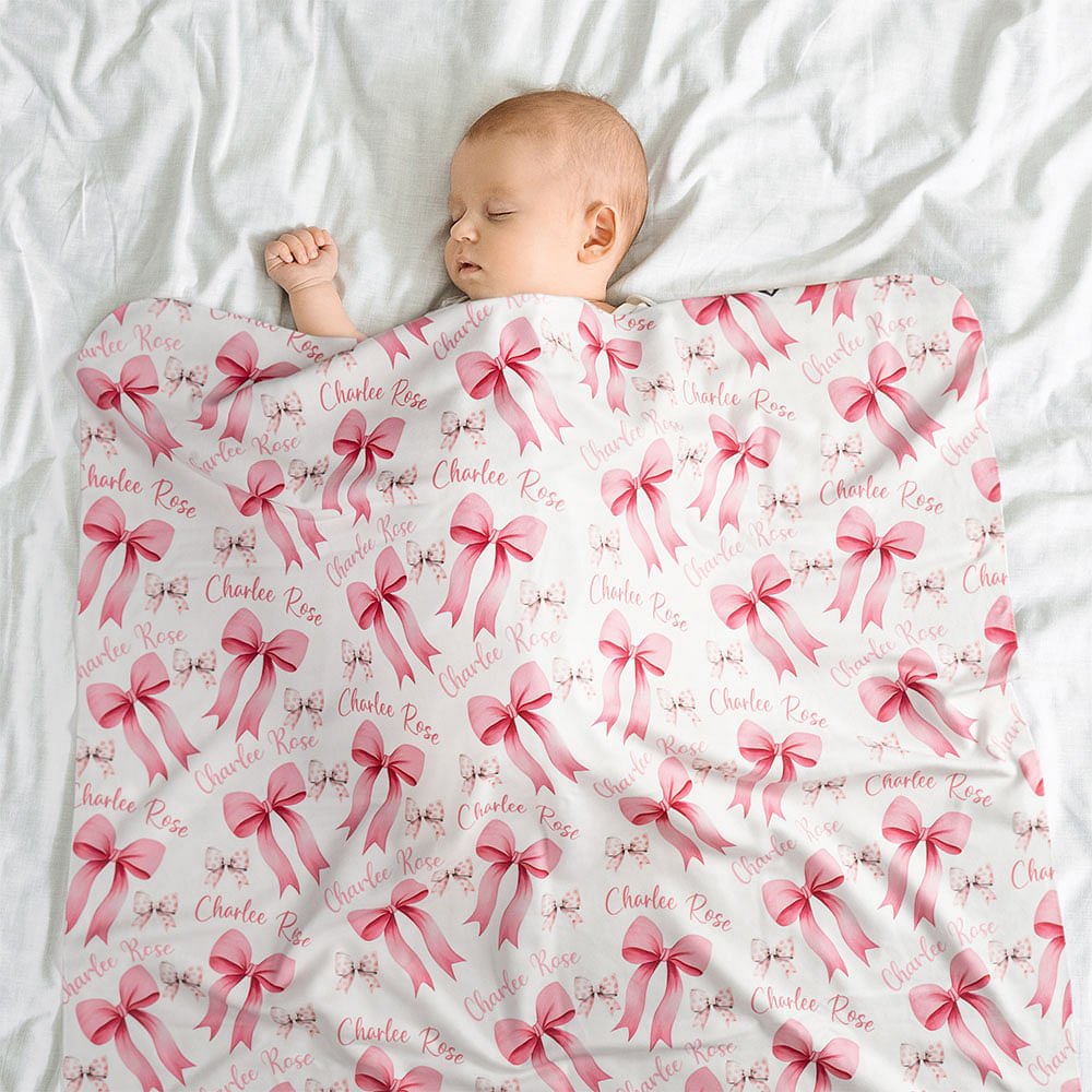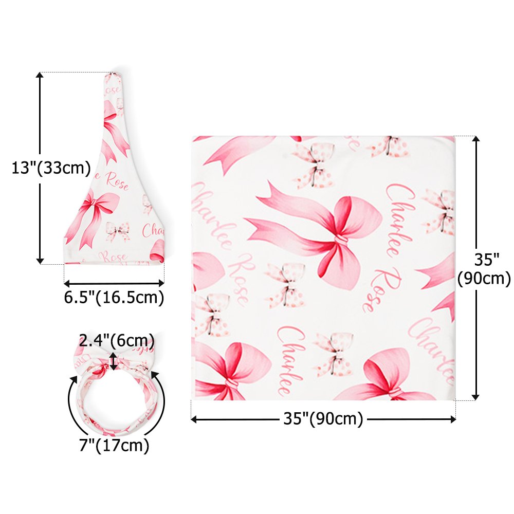 Adorned with a delicate tie-bow print in the softest shades of pink, this coordinated collection exudes a timeless elegance that will captivate onlookers. The intricate patterns and vibrant hues create a visually stunning display, perfectly complementing the natural beauty of your newborn baby.