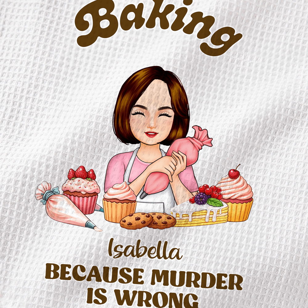 This playful kitchen towel features a charming custom cartoon baker illustration, surrounded by adorable cupcakes, Biscuits, and baking tools, paired with the hilarious, lighthearted quote "Baking Because Murder Is Wrong". Fully customizable, you can add any name to the design, turning a simple kitchen essential into a one-of-a-kind, personalized piece that reflects the baker’s personality and sense of humor.