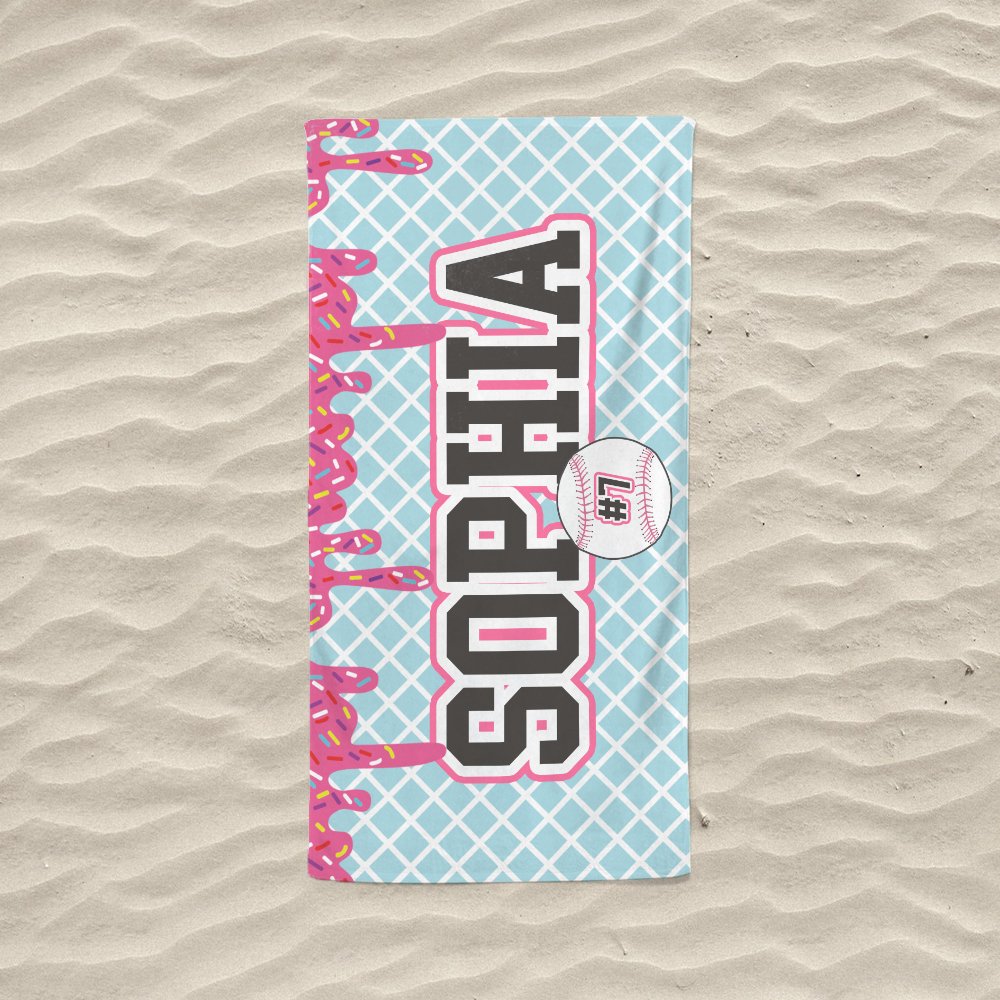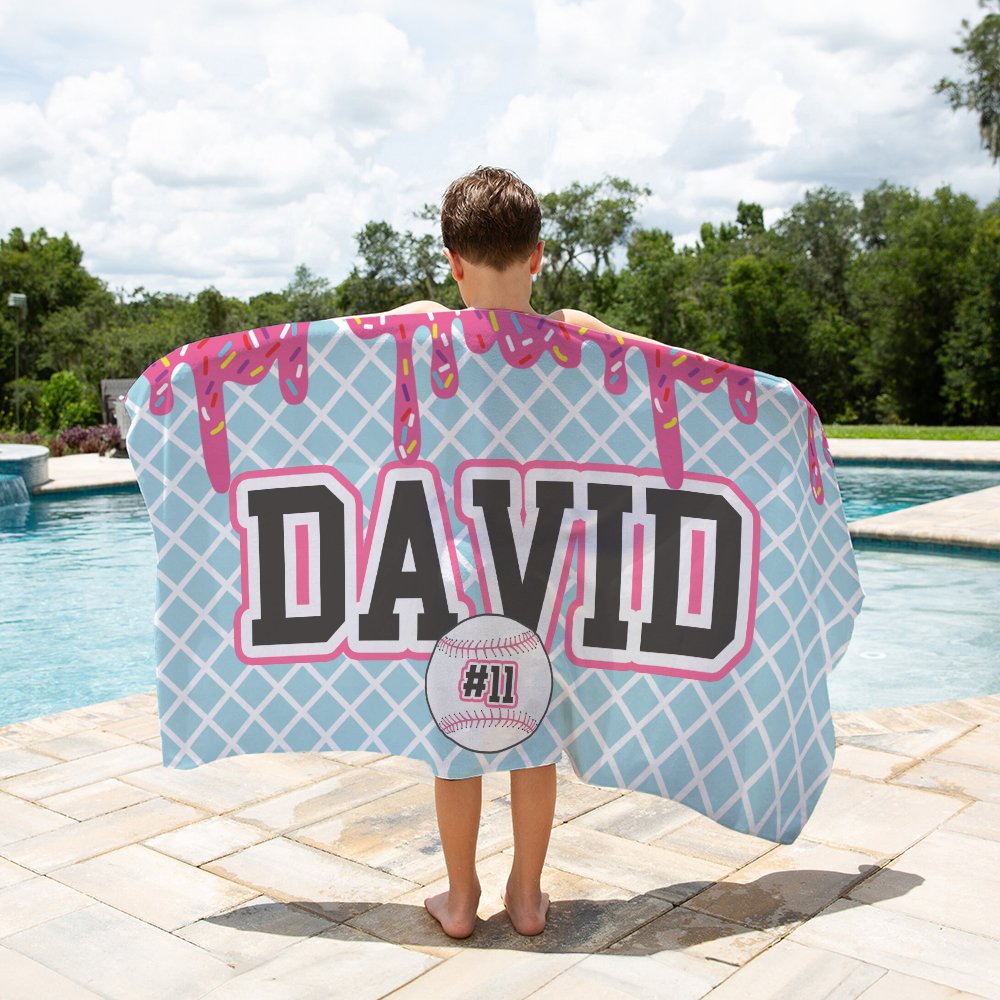 Our beach towel features an ice cream design with fresh colours. The dynamic effect of the melting ice cream drip, paired with a baseball graphic, creates a playful, lively, and lighthearted atmosphere. You can customize it with your name and number to create a unique summer accessory.