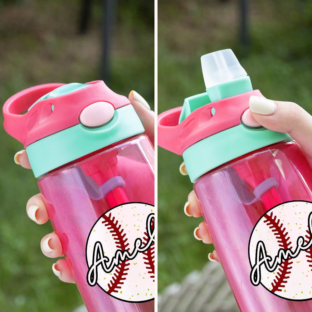 The water bottle features a built-in straw for easy sipping, making it ideal for kids on the go. The leak-proof button design ensures the tumbler remains securely closed, preventing spills and leaks, even during active play or sports activities.