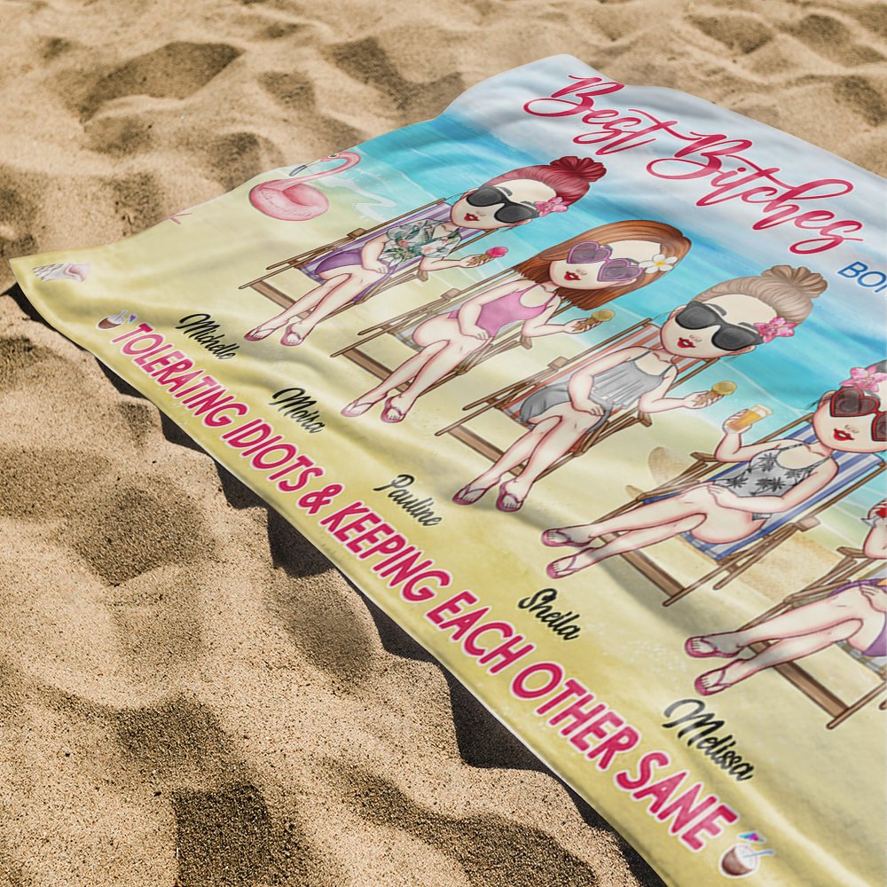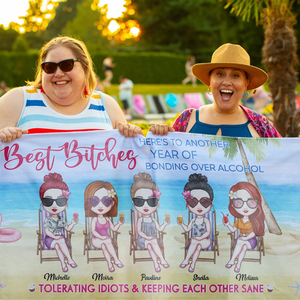 The message "Best Bitches Here's To Another Year Of Bonding Over Alcohol" is beautifully printed on the beach towel, through a witty and fun expression of friendship and it is a special gift to celebrate the heartfelt and sincere emotions between you and your friends.
