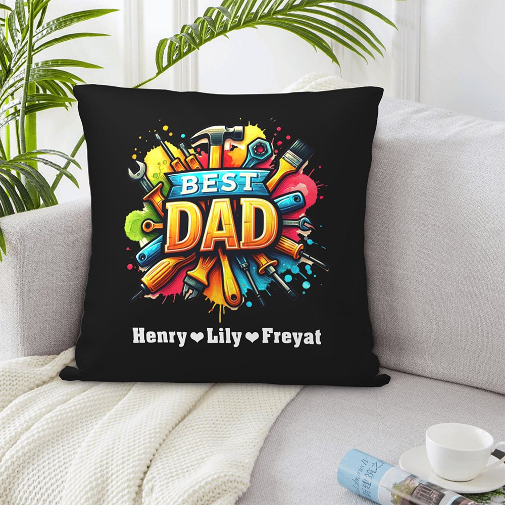 The throw pillow cover features a distinctive repair tool pattern surrounding the words "Best Dad," You can customize it with the names of up to 8 kids, sincerely showcasing the bond between father and children, making it a cherished keepsake for years to come.