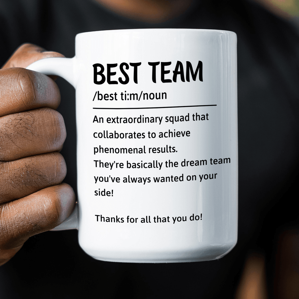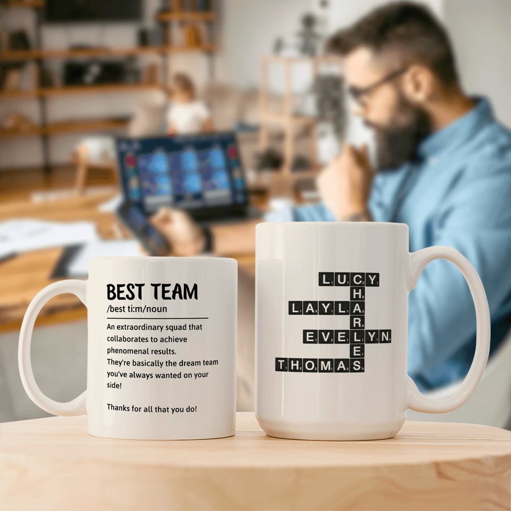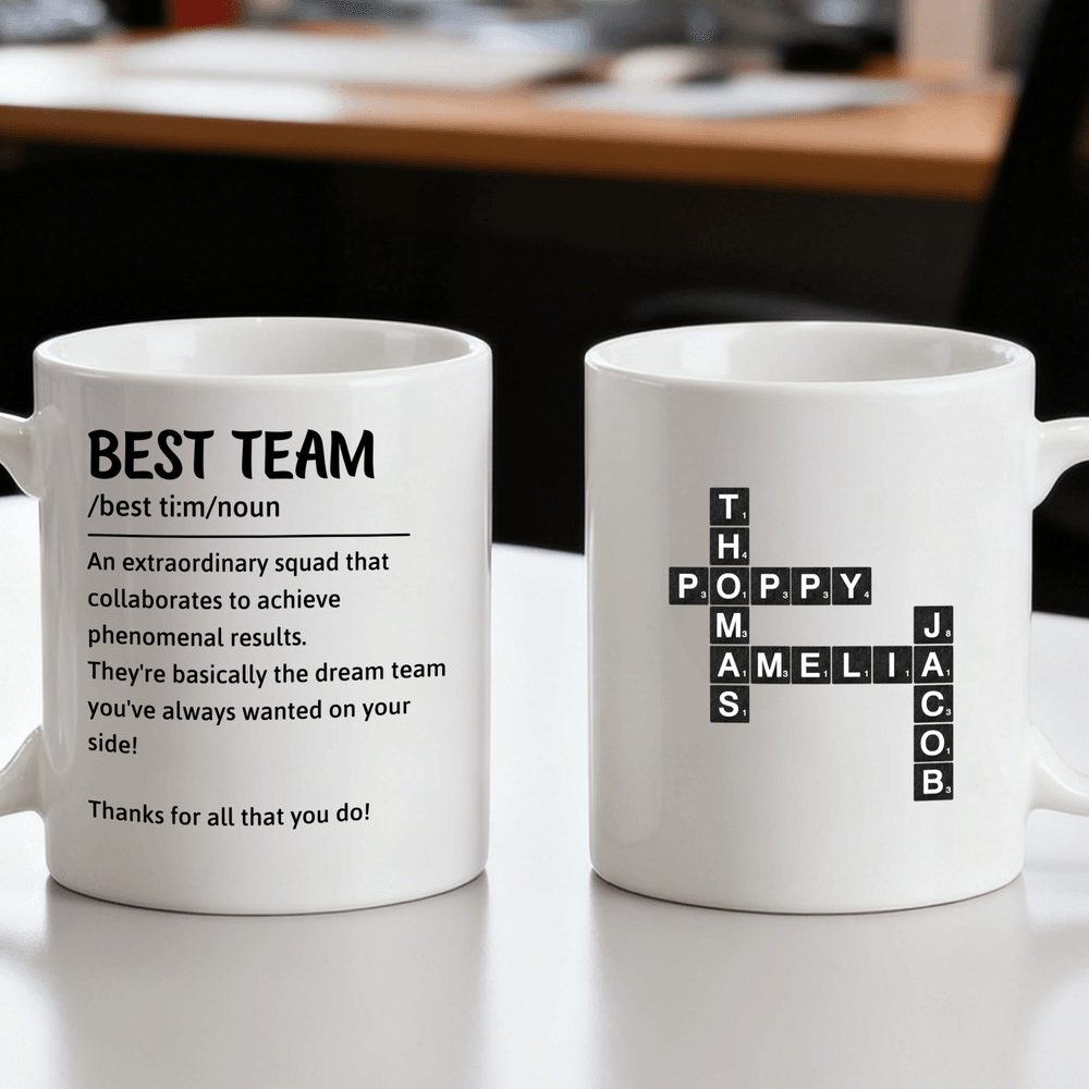 Inspired by word puzzles, one side of the mug features a humorous definition of "BEST TEAM," while the other side creatively displays team member names or keywords in a Scrabble-style letter-block format. This cleverly blends playful word games with team spirit, resulting in a personalized and meaningful commemorative design.