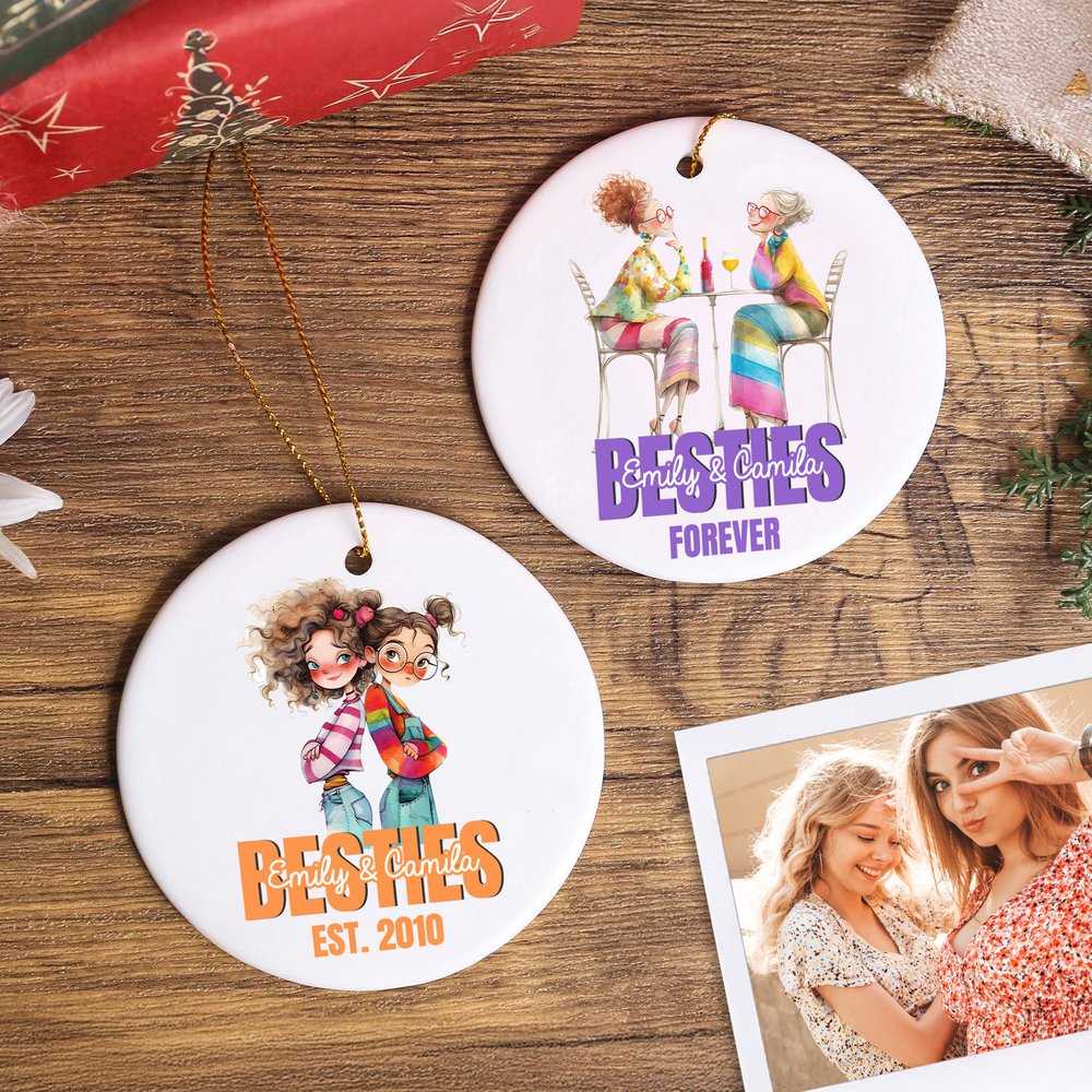 This circular ceramic ornament offers 30 customizable watercolour cartoon designs. You can add custom names and text, turning it into a one-of-a-kind keepsake that celebrates your unique friendship.