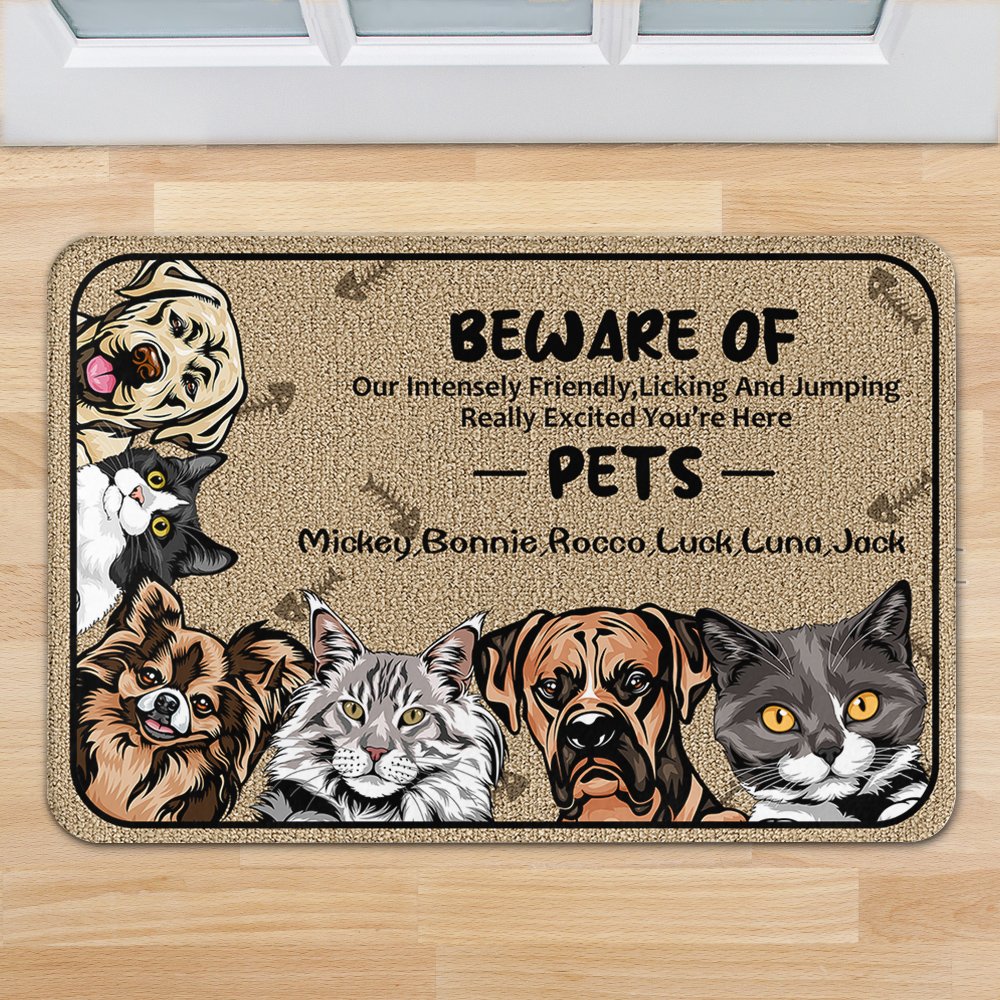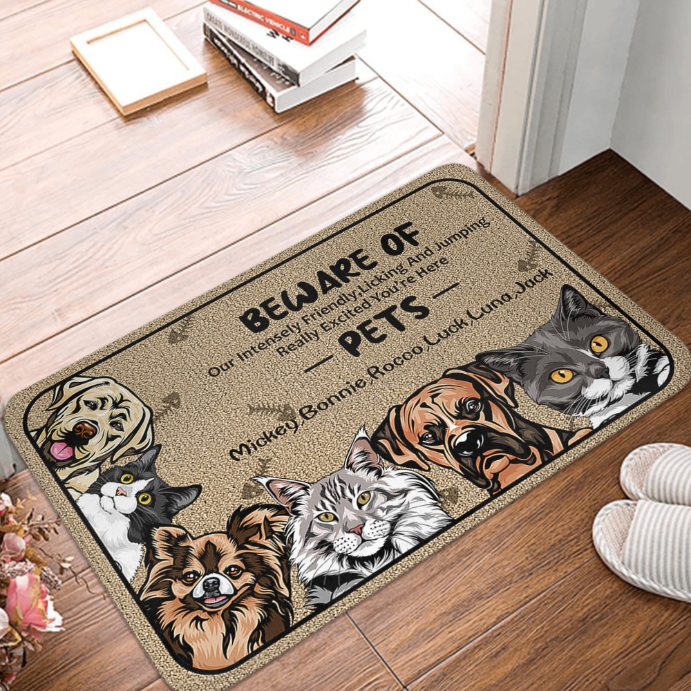 With the playful text "Beware of pets, my/our intensely friendly", this mat serves as an interesting home decor. It's a fun and playful way to express your love for your pet and set a lighthearted tone in your household.