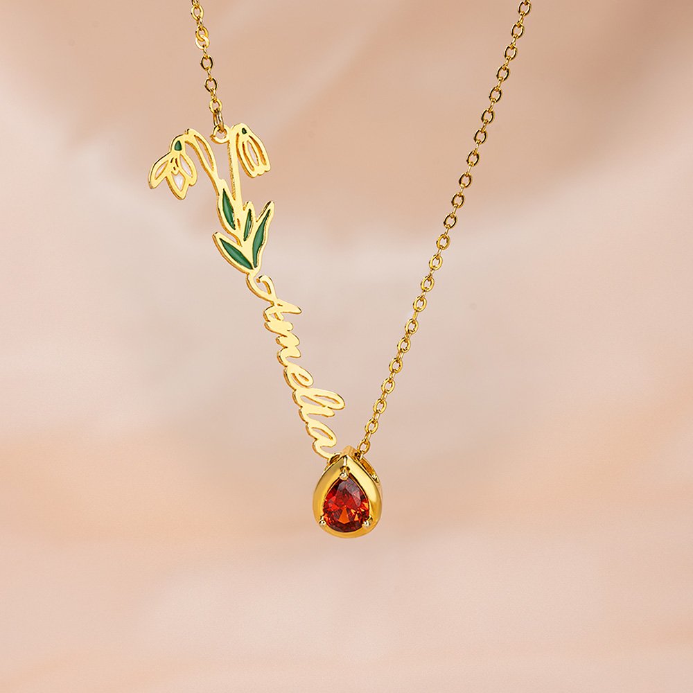 Introducing our necklace - a masterpiece of sentiment and style. This necklace features vibrant birth flowers and birthstones, with the added touch of the customizable sideways name. Combining colorful birth flowers, names, and prominent birthstones creates an elegant and meaningful minimalist jewelry piece.