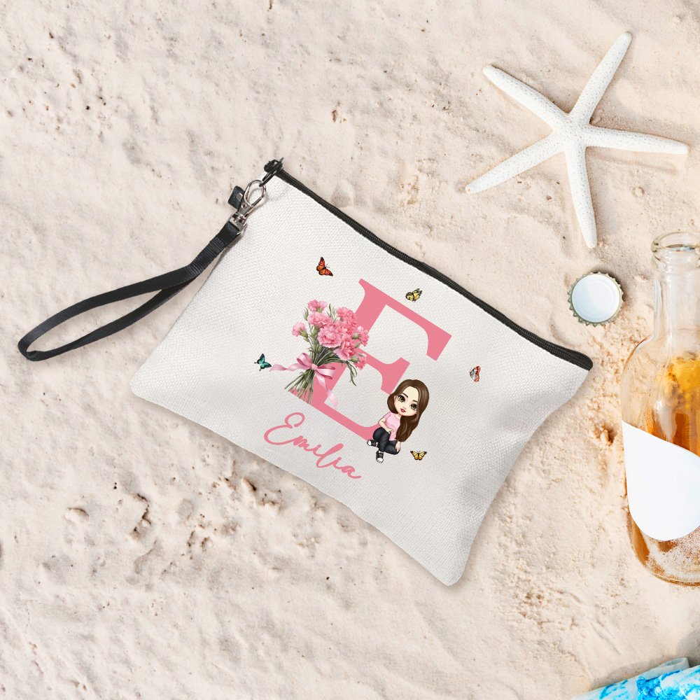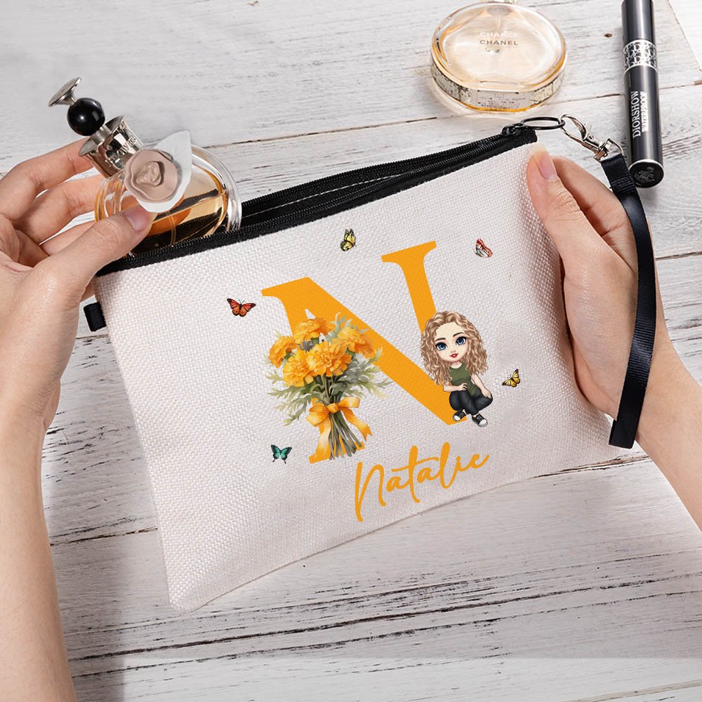 This canvas makeup bag is designed with a cute cartoon girl or woman, adorned with a beautiful birth flower. You can customize it with your initial and name to create a one-of-a-kind gift bag.