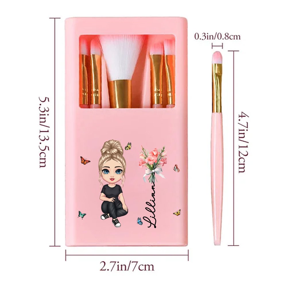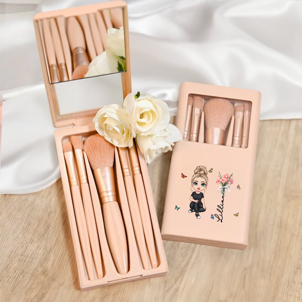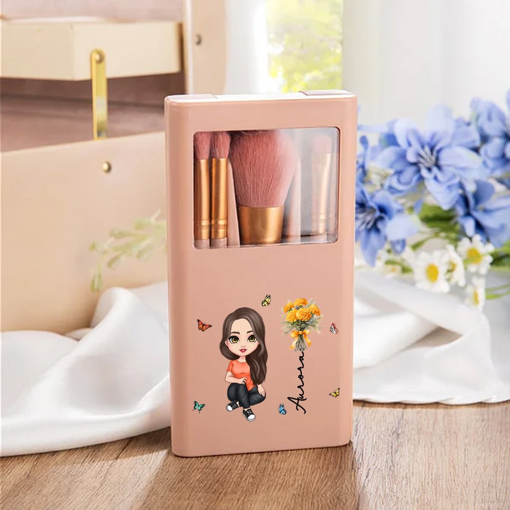 The set features a beautiful combination of birth flower bouquets and a cute cartoon character, making it stand out from ordinary makeup brush sets. The cartoon character on the travel storage box is a delightful addition. The character is surrounded by butterflies and flowers, creating a whimsical and feminine atmosphere.
