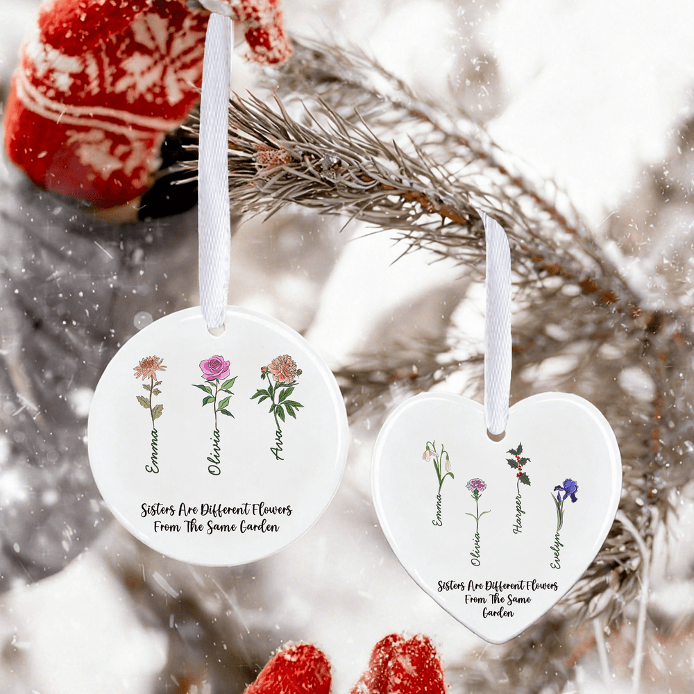 Personalized Birth Flower Heart Round Ceramic Ornament with Name Tree Decor Christmas Gift for Family Sister