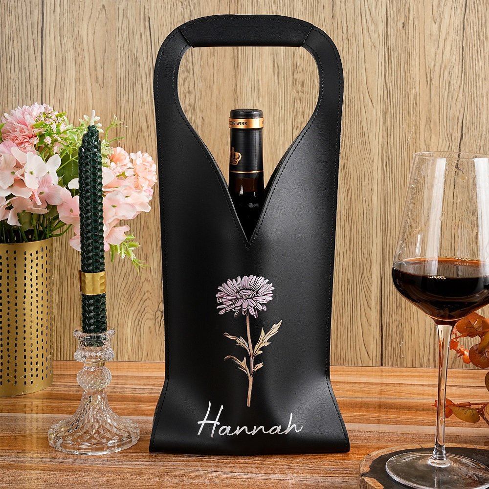 Personalized Birth Flower Leather Wine Bag with Name and Handle Protective Wine Accessories Birthday Dinner Party Gift for Wine Lover
