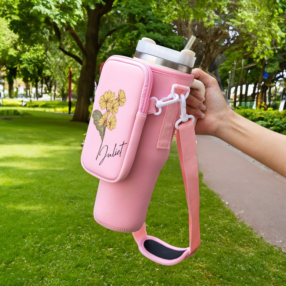 This water bottle carrier bag features a unique birth flower design. You can choose a birth flower that represents your birthday month. It can also be Personalized with a name, perfect to show off your personality!