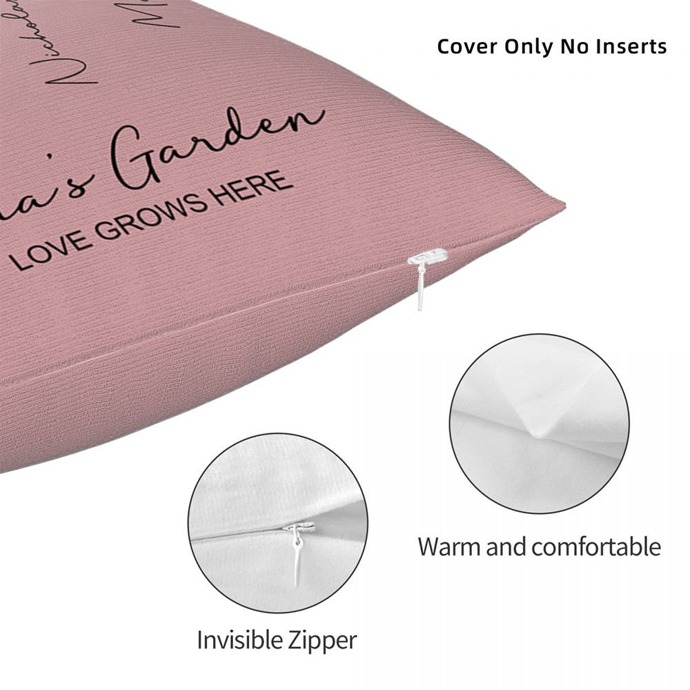 What truly distinguishes this pillow cover is the personalization option. Envision the joy on your loved one's face as they discover their name elegantly woven into the floral motif. The phrase "Love Grows Here," embroidered on the cover, serves as a tender reminder of the love and warmth that permeate your space.