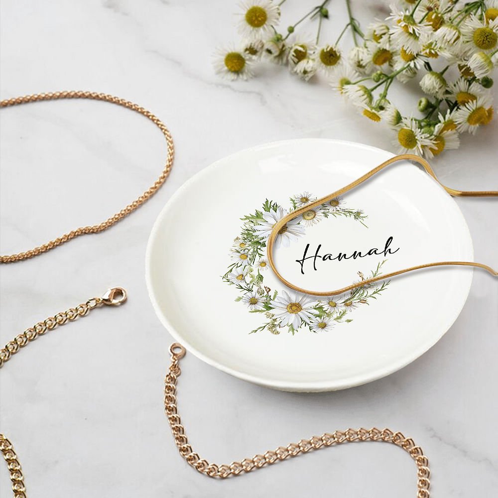 This exquisite trinket dish features a customizable birth flower design with the recipient's name, making it a thoughtful and unique gift that celebrates their individuality and special moments.