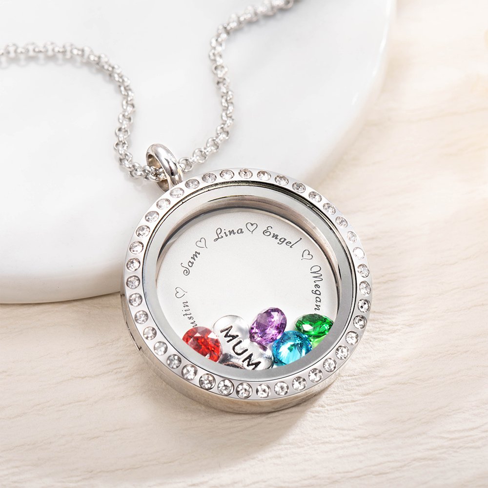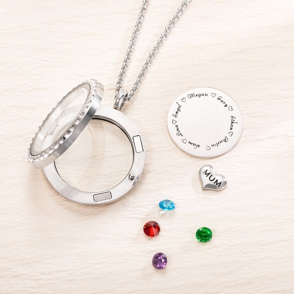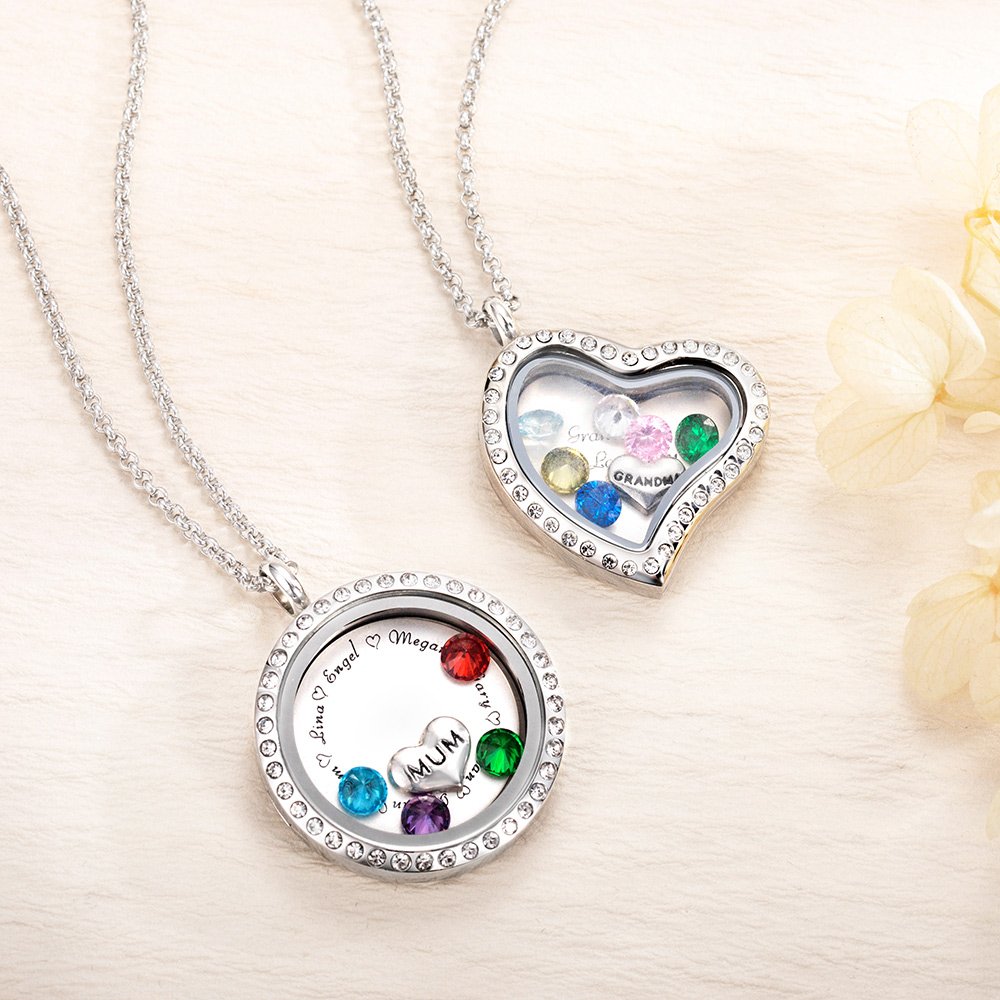 This beautiful necklace features a floating locket pendant that can be customized with 1-7 birthstones and a heart-shaped charm. It can create a meaningful and unique piece of jewellery for mothers.