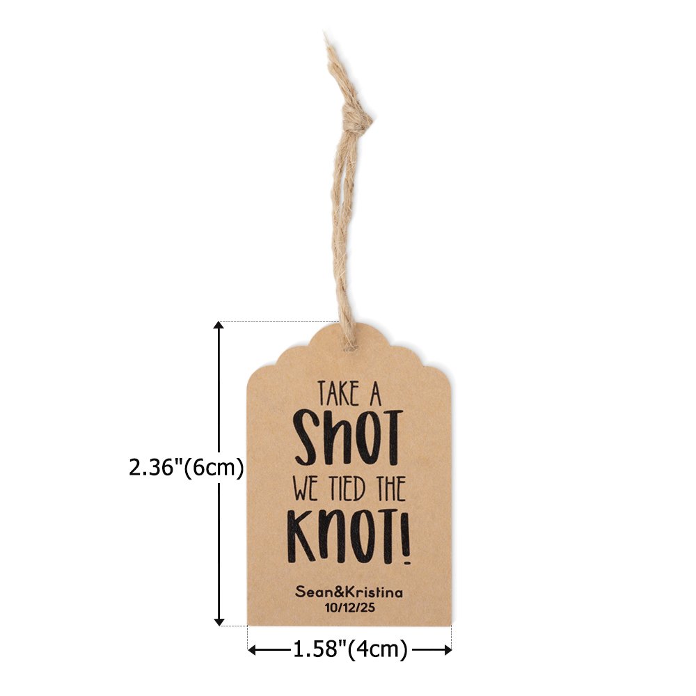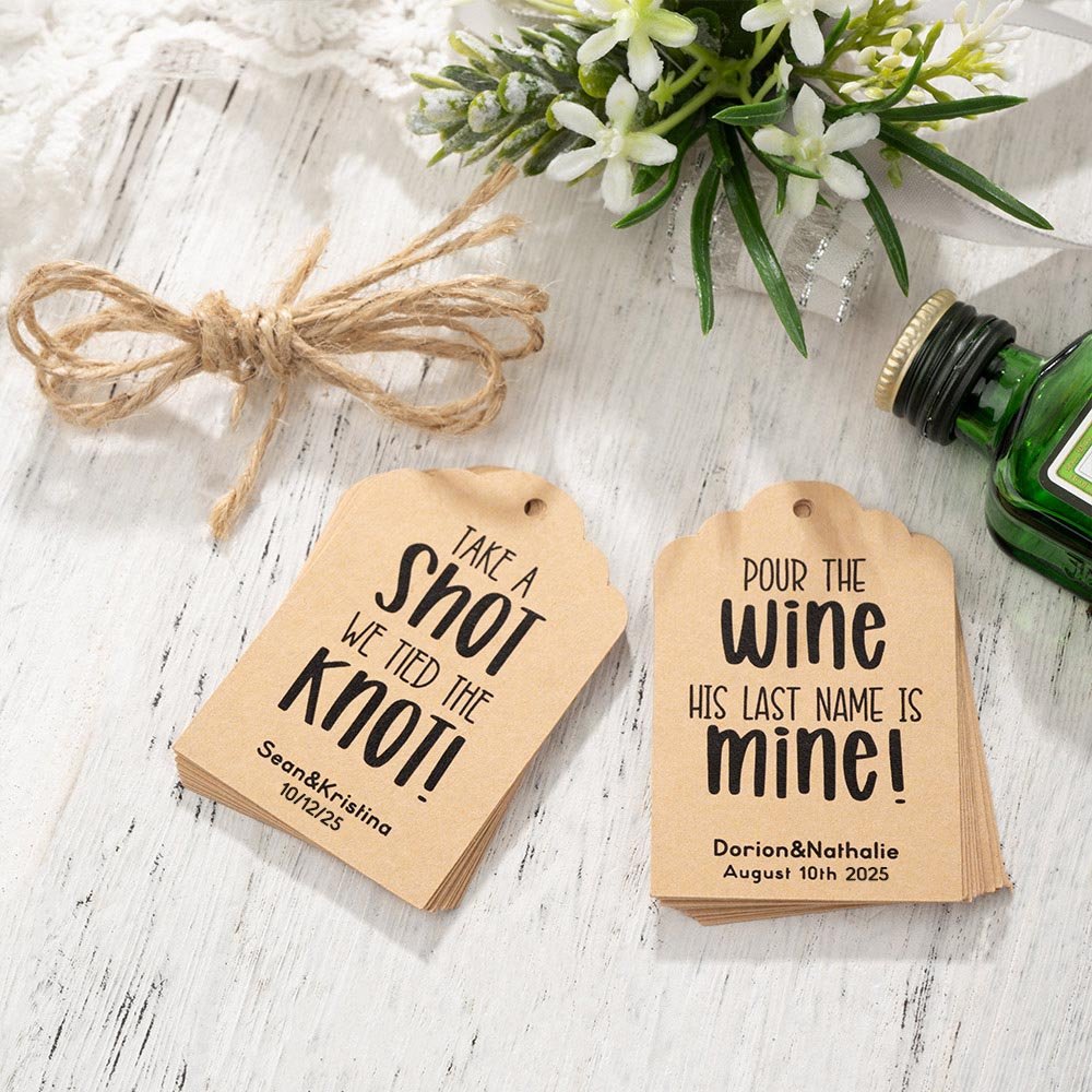 The labels come in two versions, "Take a Shot We Tied the Knot!" and "Pour the Wine His last name is mine!". Both labels are thoughtfully designed to celebrate the newlyweds tying the knot and toast to the happy couple. The labels have customizable options to include names and dates, making them a unique keepsake for your guests. The attractive kraft paper material offers a rustic yet elegant aesthetic that perfectly complements your wedding style.