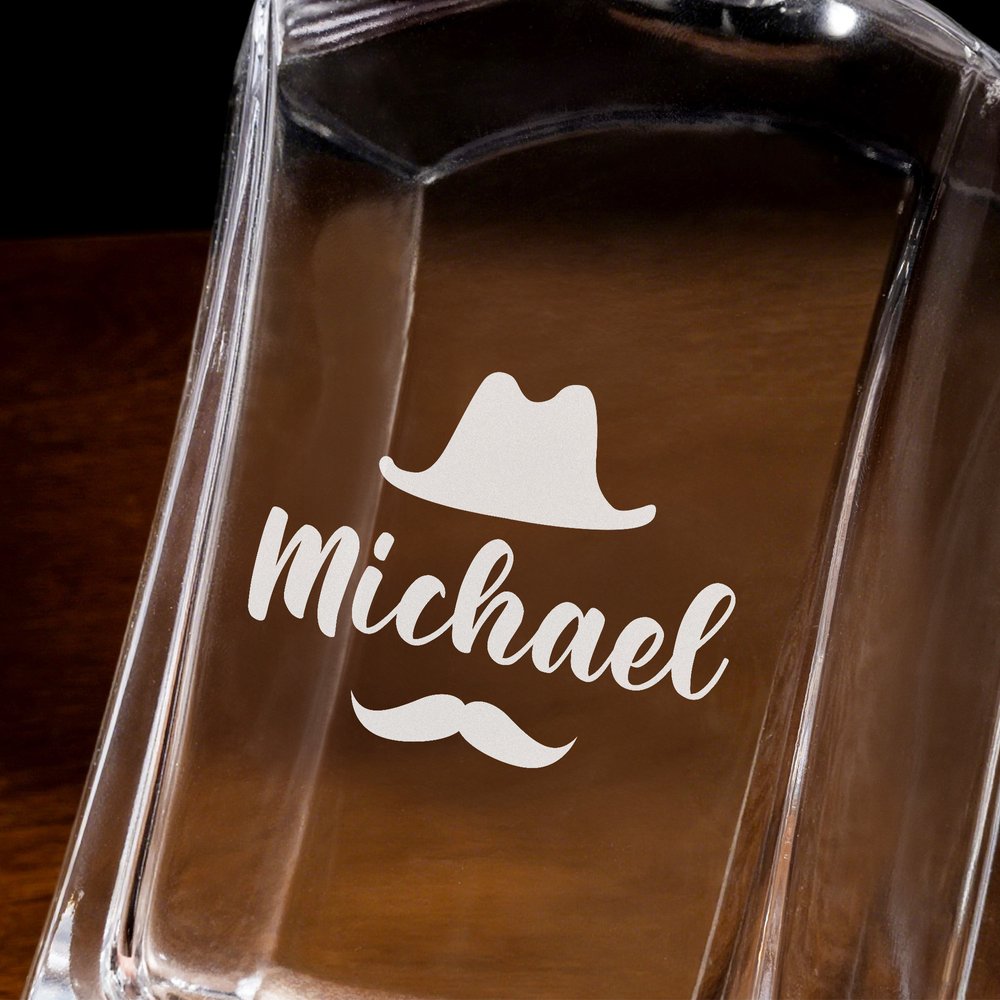The engraving technique brings together elements such as suits, bow ties, top hats, and beards, paired with names, dates, and text, creating an elegant and sophisticated style. The custom patterns on the glass complement each other, showcasing style and creating a personalized drinking ritual.