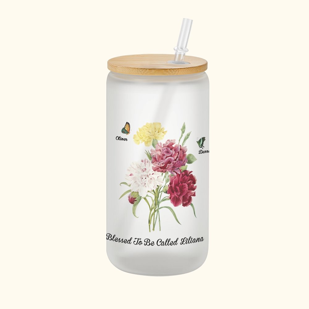 The ideal gift for Mother's Day, this glass cup is adorned with a bouquet of carnations surrounded by butterflies for a beautiful message. You can choose the number of butterflies, add a name and the recipient's title, and the bottom of the cup has a thoughtful phrase "Blessed to be called", adding more warmth.