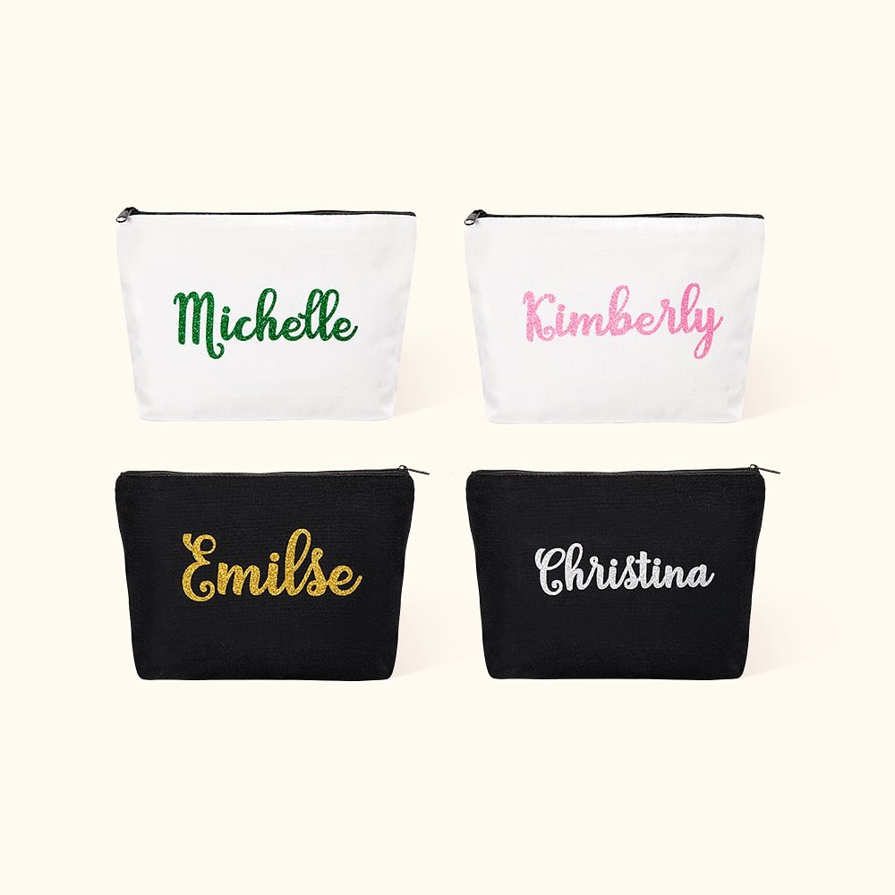 This cosmetic bag's design is simple yet charming. It comes in two colors, and you can also print your name on it. The glittery name design can make people notice at a glance.