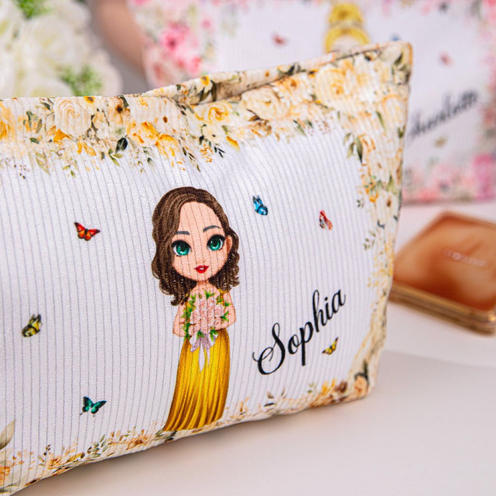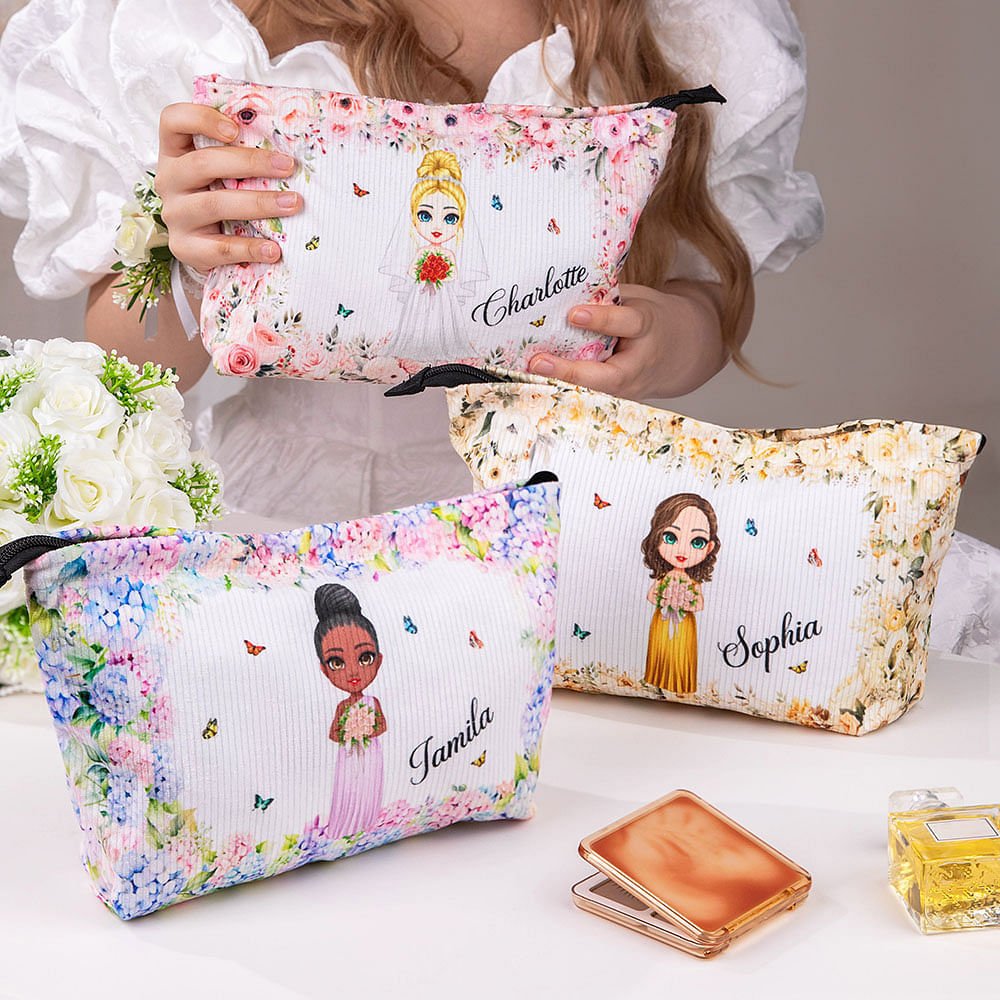 This makeup bag features a charming selection of floral backgrounds and customizable cartoon images of the bride and bridesmaids. This delightful design makes it an innovative and one-of-a-kind gift, perfect for weddings and bridal showers, ensuring that each bag is as unique as the individual it’s made for.