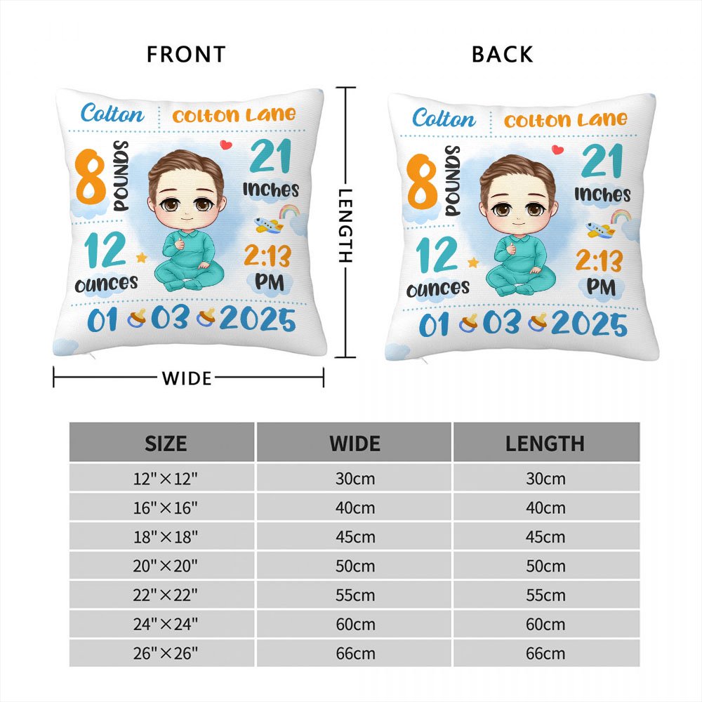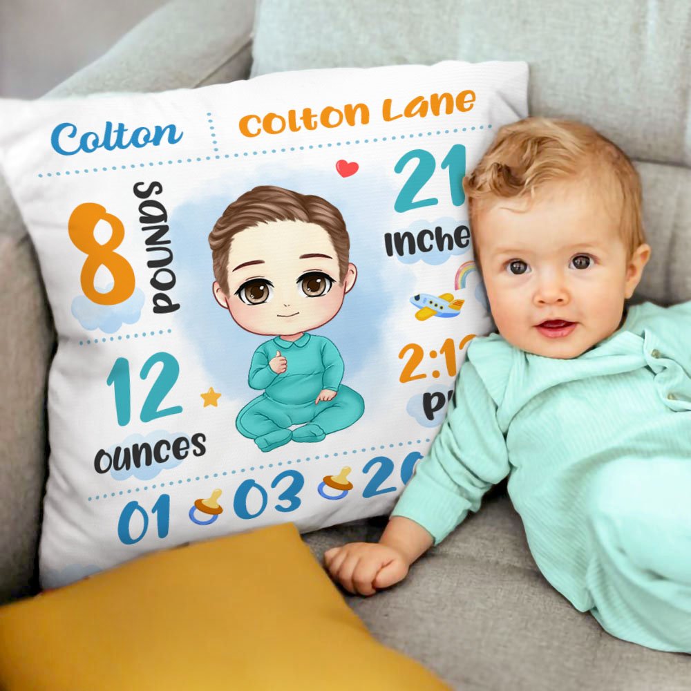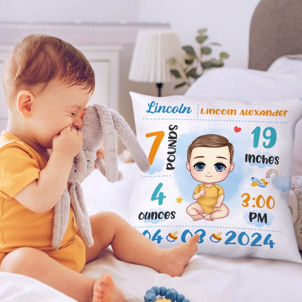 Personalized Cartoon Baby Birth Announcement Soft Throw Pillow Cover with Name Nursery Room Decor Birthday Baby Shower Gift for Newborn
