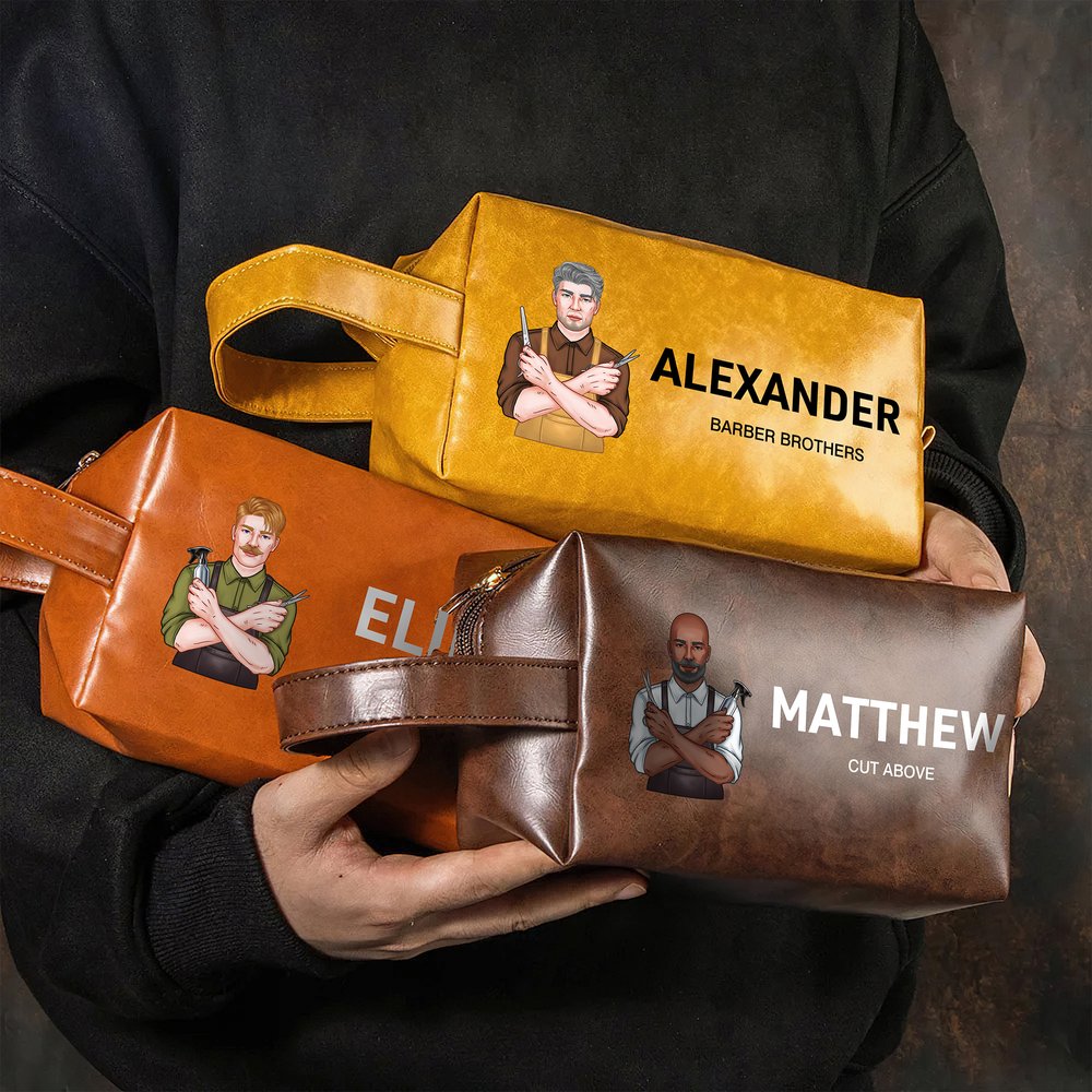 First, choose the pouch colour (8 base colours like black, coffee brown, brown, etc.), then pair it with exclusive barber cartoon clip-art. You can also customize the name and text. Combine these elements freely, create a one-of-a-kind “barber-themed toiletry bag”.