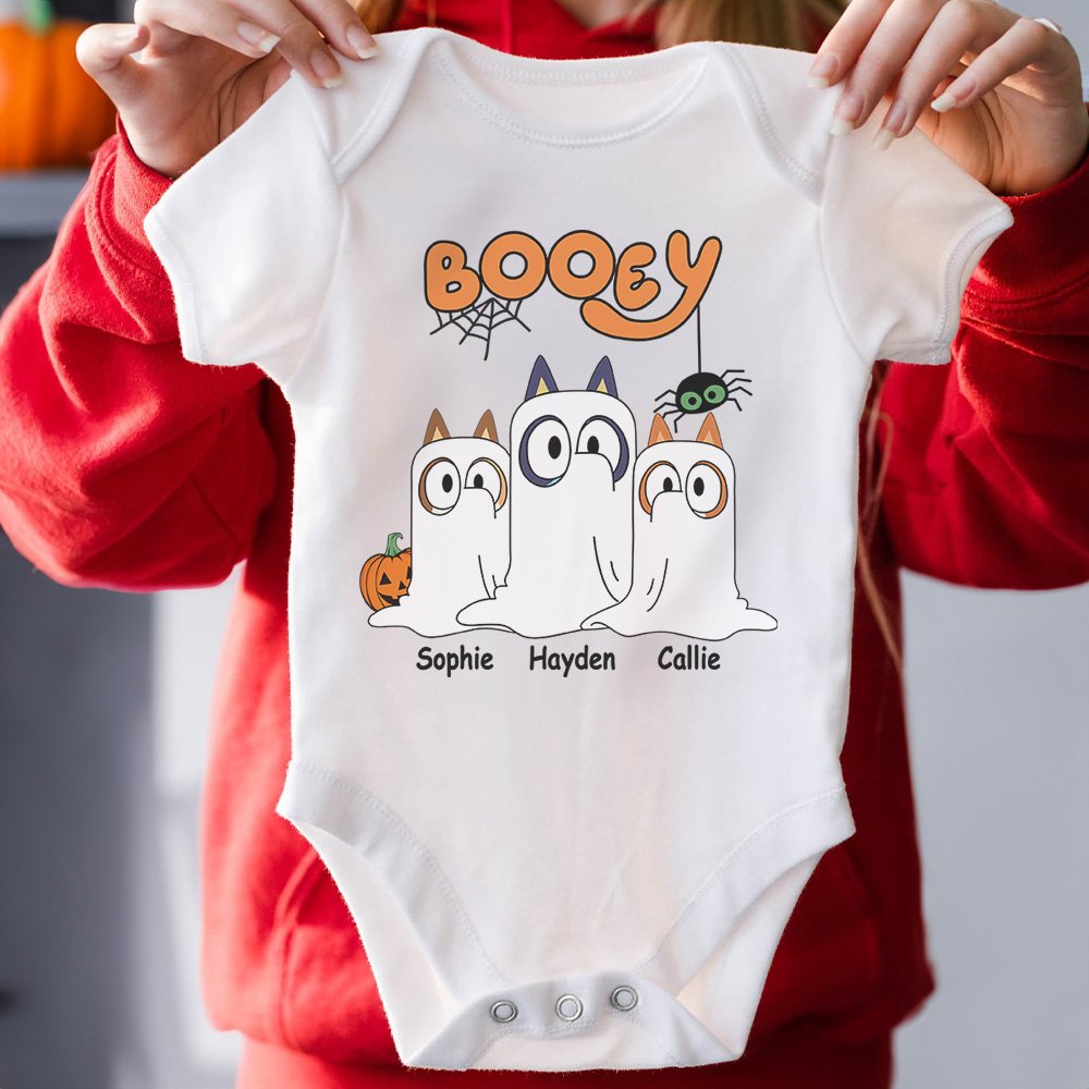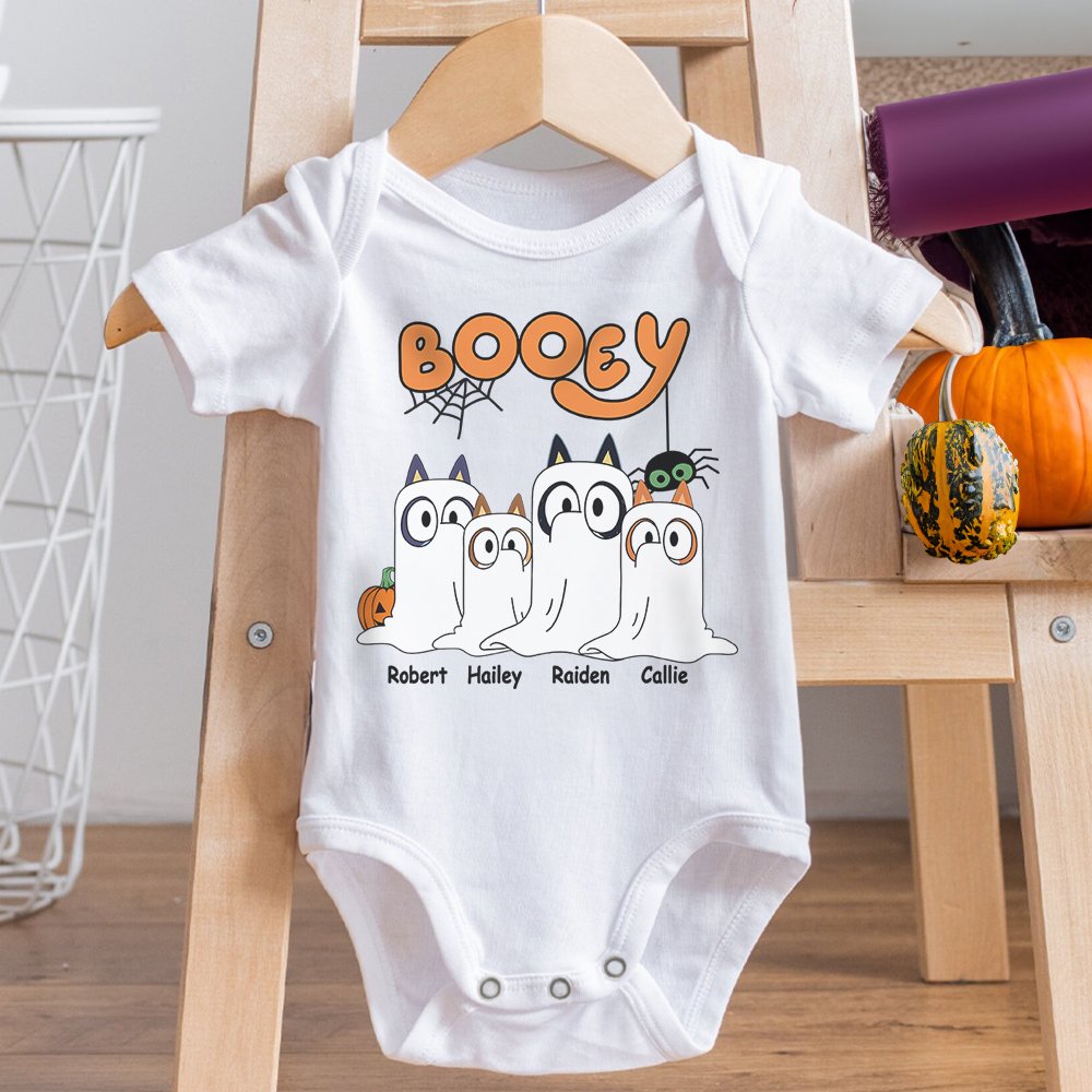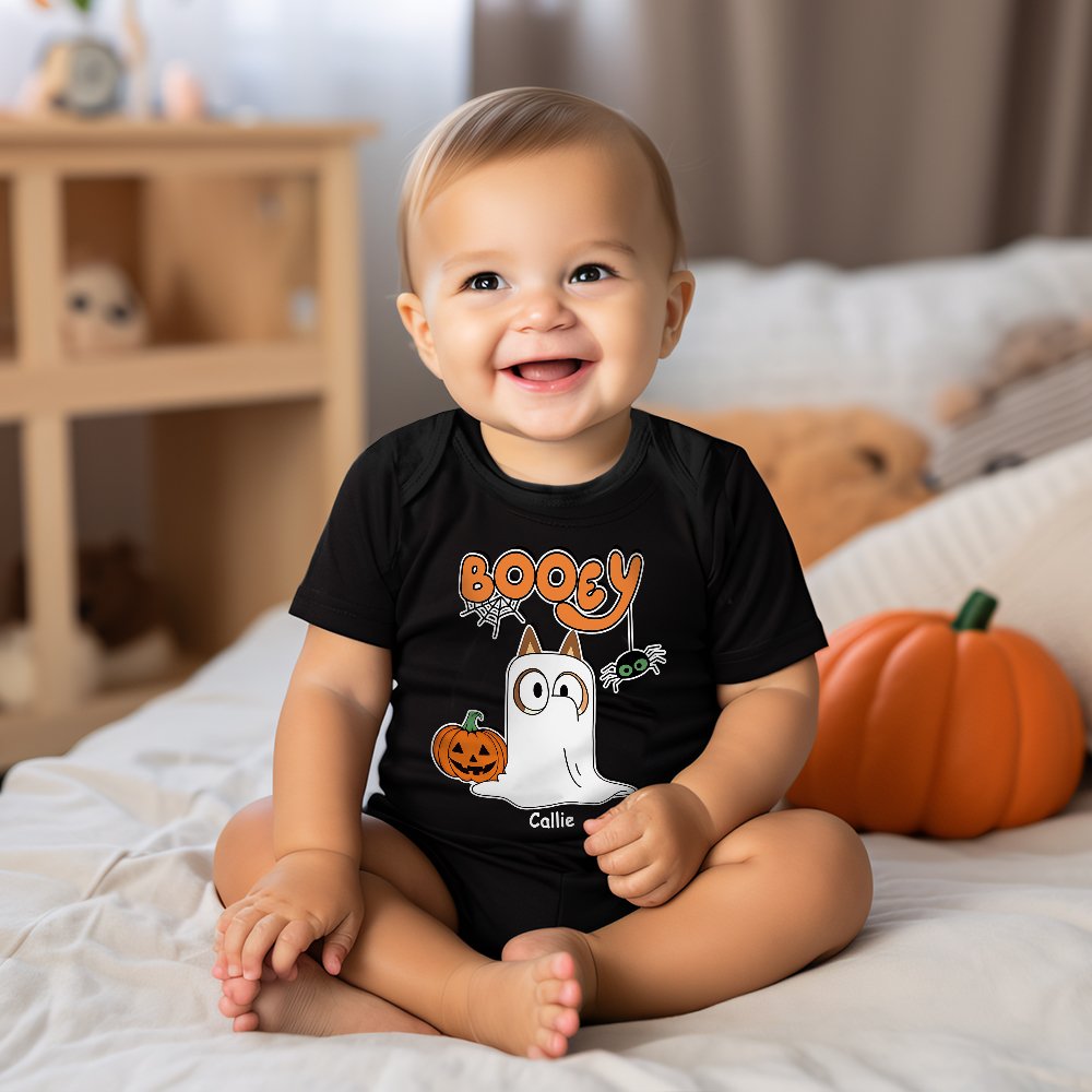 This baby bodysuit cleverly incorporates Halloween elements with cute and funny ghost images, pumpkins, and spider webs, adding more joy to your baby's holiday look. Depending on the number of family members, you can choose 1 to 6 ghost images and customize the name of each family member for each ghost, making your baby's crawling suit more personalized and memorable.