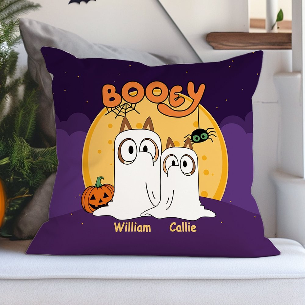 This delightful design features the adorable booey ghost dog alongside playful pumpkins and vibrant colors that capture the season's festive spirit. The charming illustration is complemented by the option to add your loved one's name, making it a truly unique piece that will brighten up any space. This pillow cover is perfect for kids and adults alike and adds a whimsical touch to your Halloween decor.