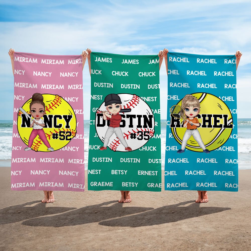 This beach towel features ball sports elements along with customizable cartoon character designs. You can design a unique character online, add a Personalized name or number, and give this beach towel a distinctive personal charm.