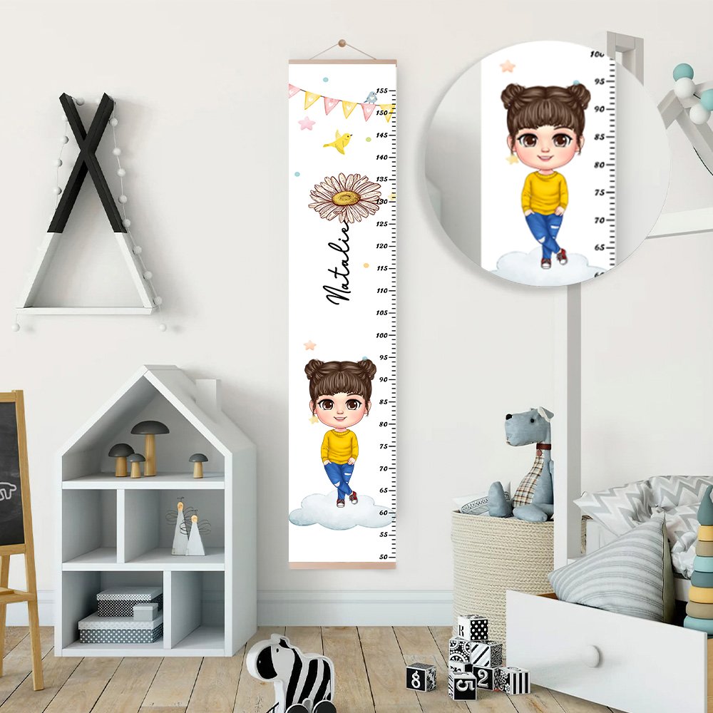 The growth chart features an adorable cartoon boy or girl, adorned with a birth flower or fantasy balloon. Its vibrant colours and playful illustrations make it welcomed by every kid.